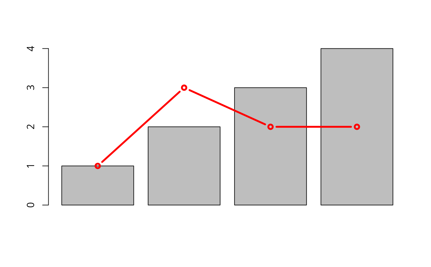 lines(1:4, c(1,3,2,2), lwd=3, type='b',col='red')