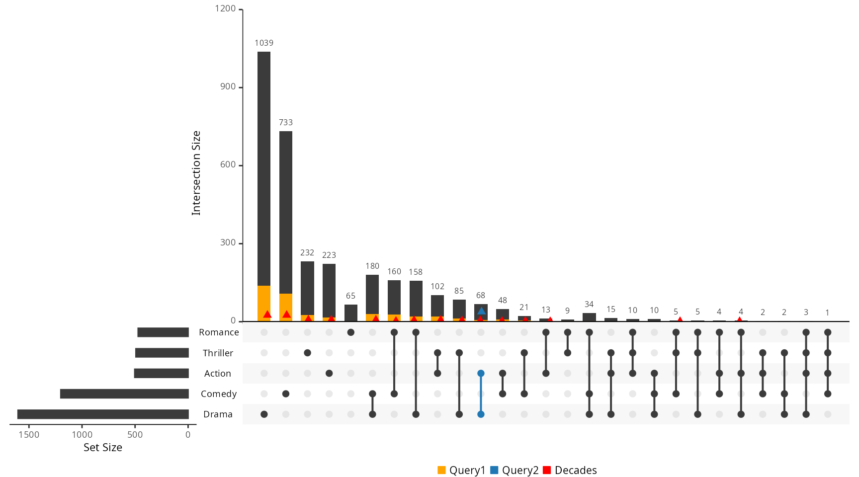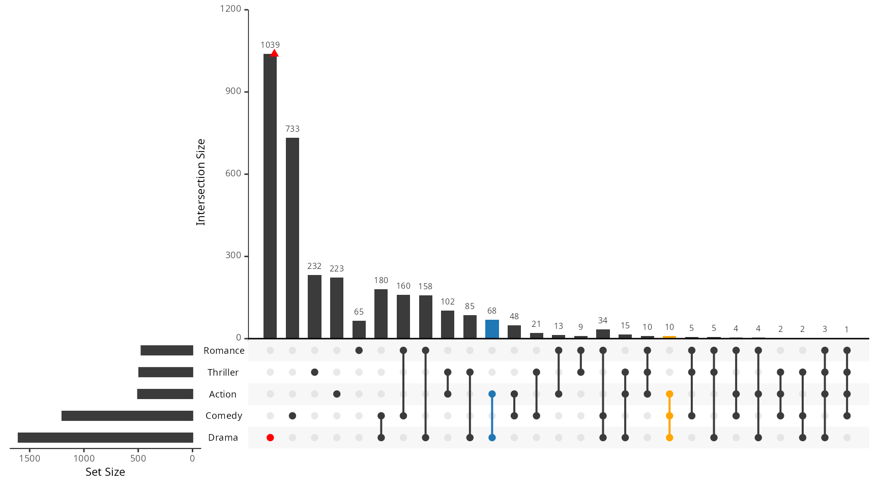 upset(movies, queries = list(list(query = intersects, params = list("Drama", "Comedy", "Action"), color = "orange", active = T), list(query = intersects, params = list("Drama"), color = "red", active = F), list(query = intersects, params = list("Action", "Drama"), active = T)))## Warning: `aes_string()` was deprecated in ggplot2 3.0.0.