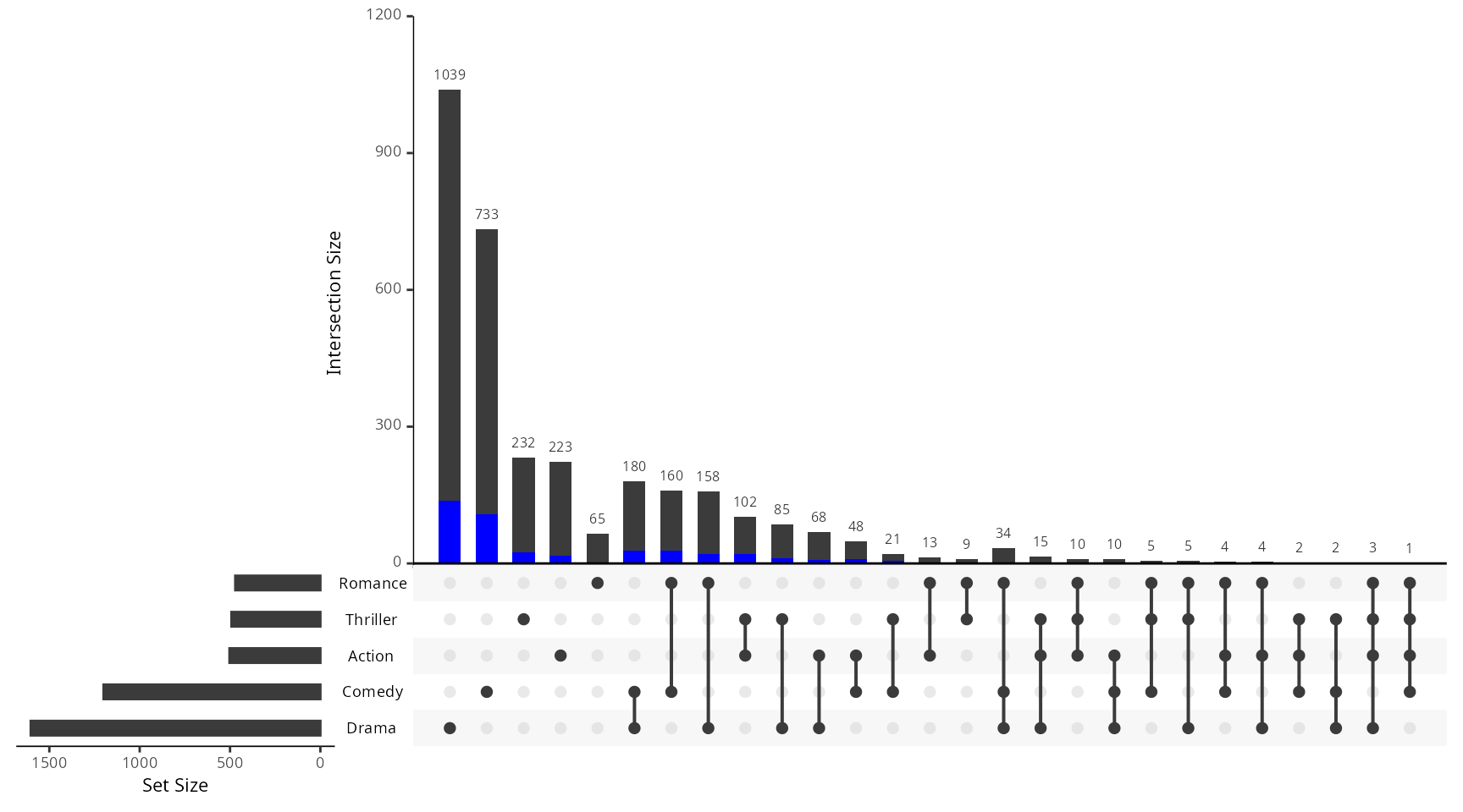 upset(movies, queries = list(list(query = Myfunc, params = list(c(1970,1980, 1990, 1999, 2000), 2.5), color = "blue", active =T)))## Warning in geom_point(data = pCustomDat, aes_string(x = "x", y = "freq2"), :