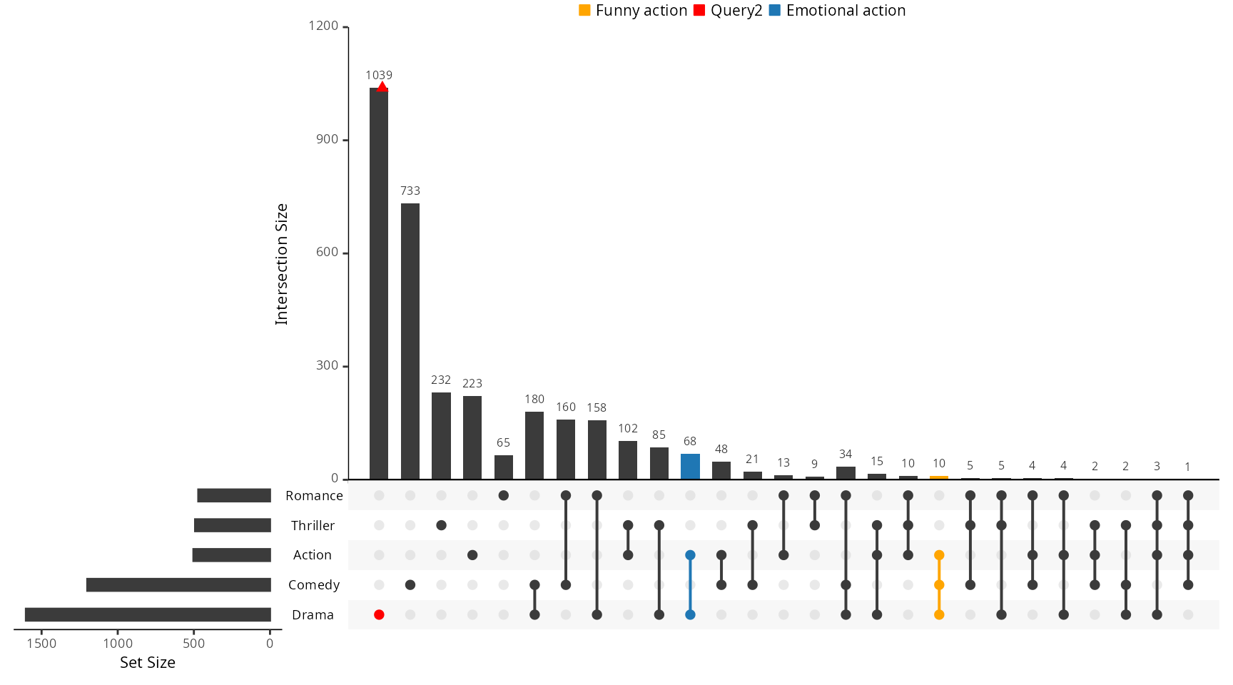 upset(movies, query.legend = "top", queries = list(list(query = intersects, params = list("Drama", "Comedy", "Action"), color = "orange", active = T, query.name="Funny action"), list(query = intersects, params = list("Drama"), color = "red", active = F), list(query = intersects, params = list("Action", "Drama"), active = T, query.name="Emotional action")))