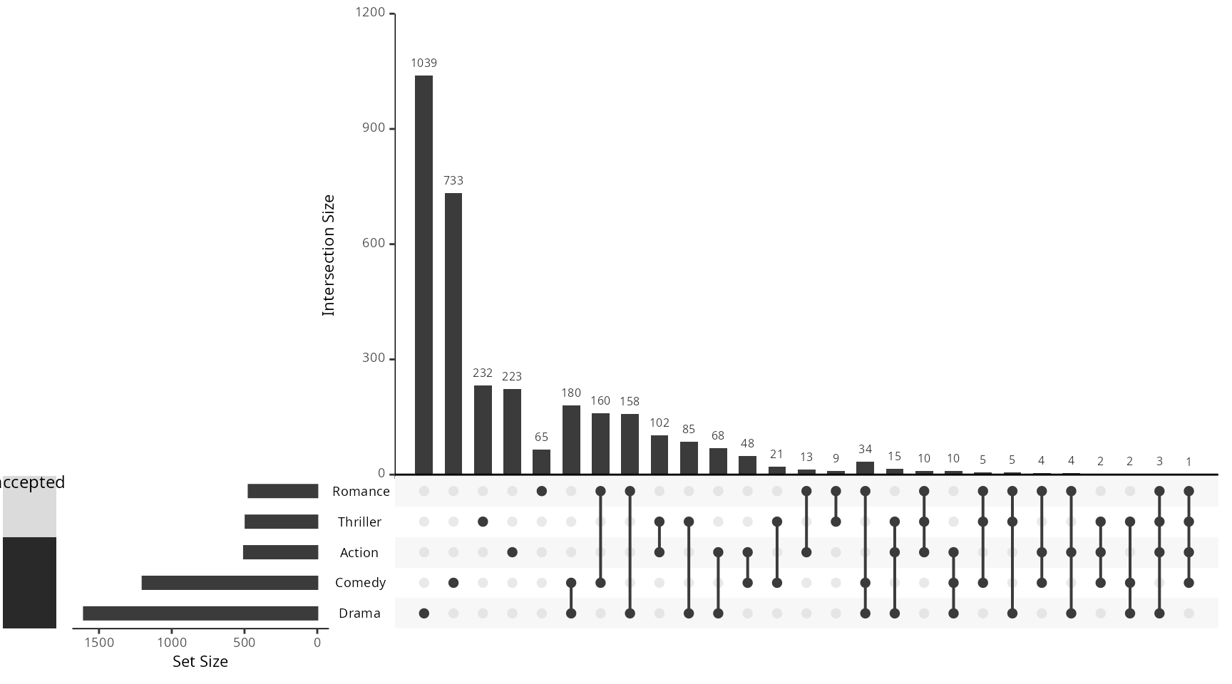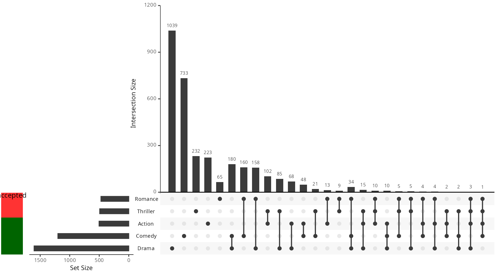 upset(movies, set.metadata = list(data = metadata, plots = list(list(type="bool", column= "accepted", assign = 5, colors = c("#FF3333", "#006400")))))