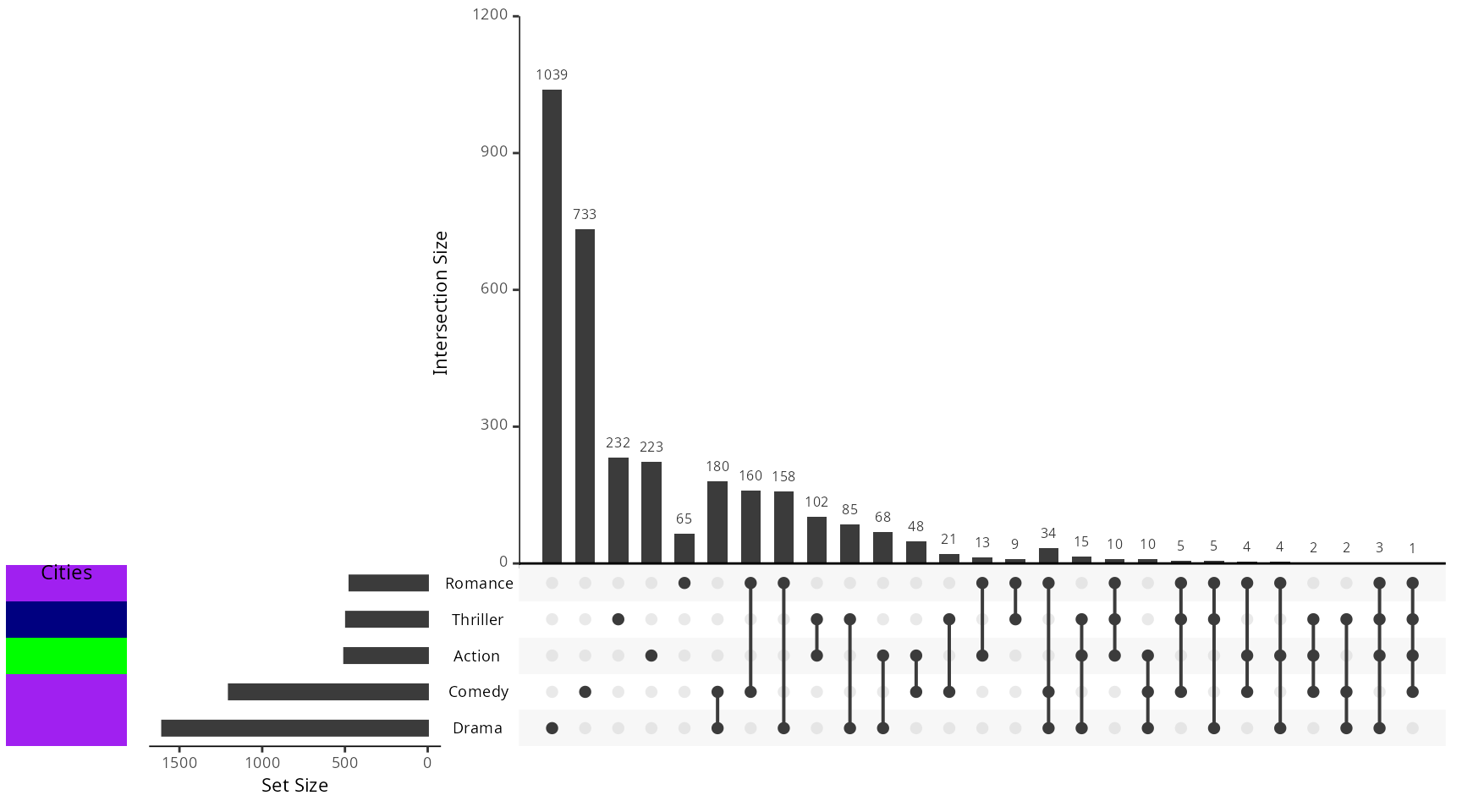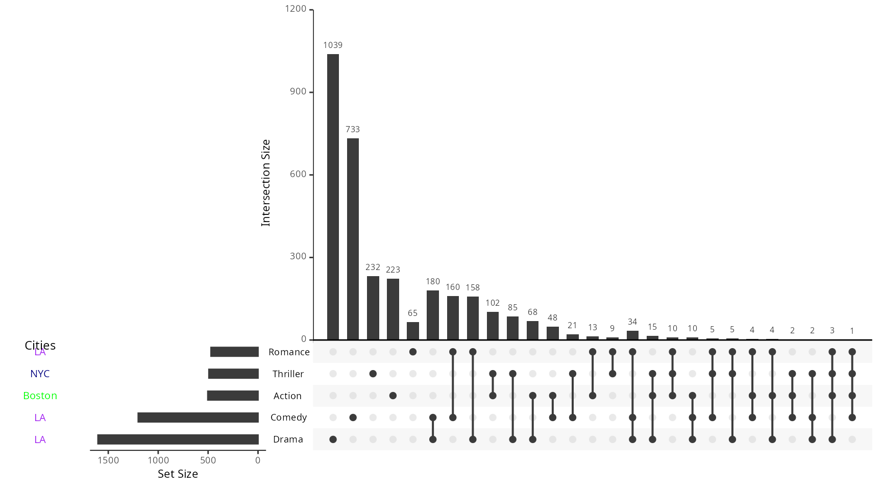 upset(movies, set.metadata = list(data = metadata, plots = list(list(type = "heat", column = "Cities", assign = 10, colors = c("Boston" = "green", "NYC" = "navy", "LA" = "purple")))))