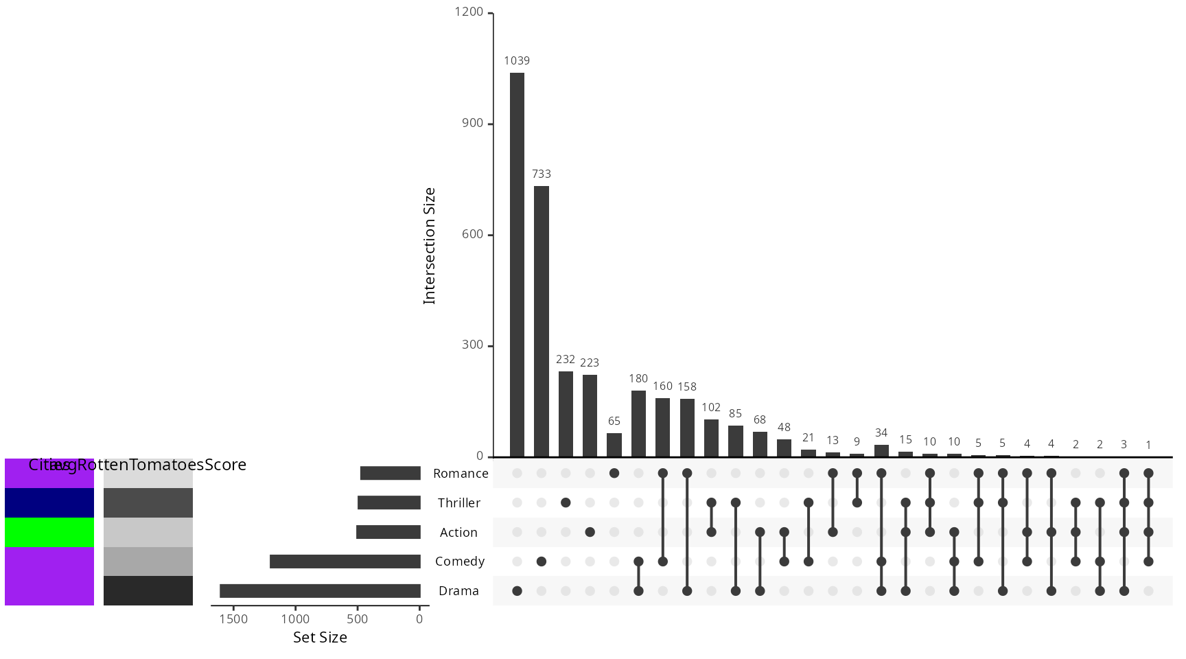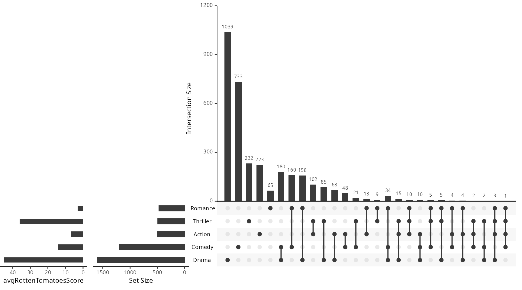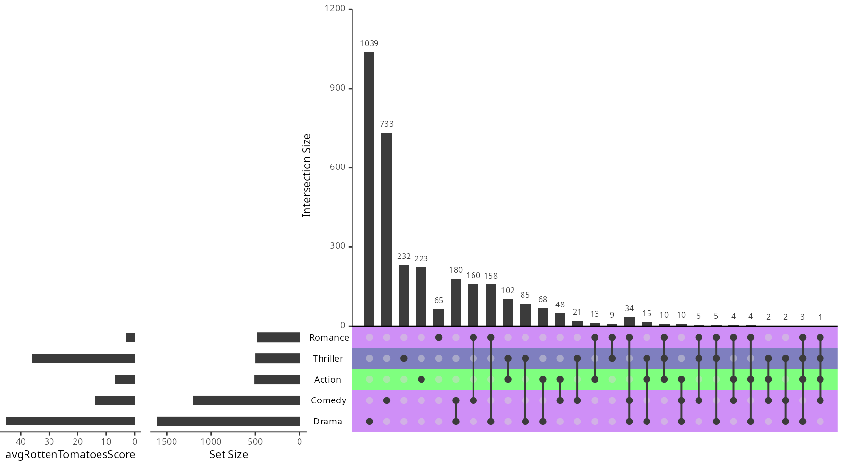 upset(movies, set.metadata = list(data = metadata, plots = list(list(type="hist", column="avgRottenTomatoesScore", assign=20))))## Warning: `aes_string()` was deprecated in ggplot2 3.0.0.