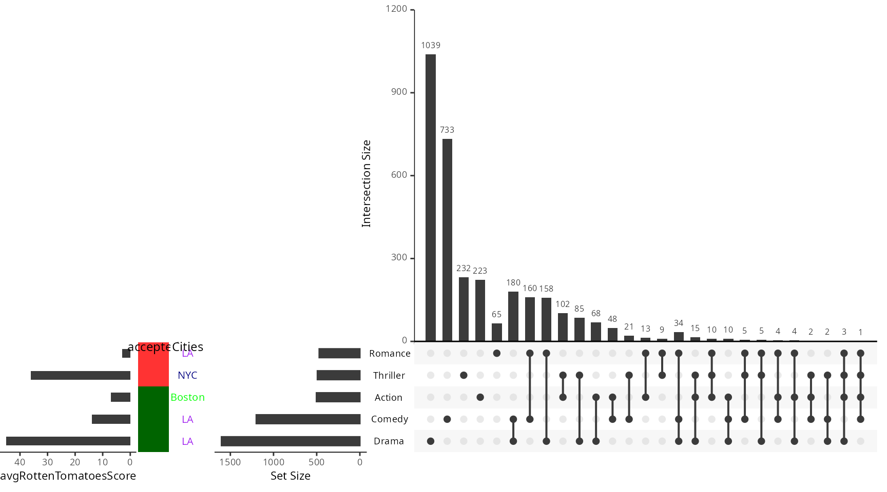 upset(movies, set.metadata = list(data = metadata, plots = list(list(type="hist", column="avgRottenTomatoesScore", assign=20),list(type="bool", column= "accepted", assign = 5, colors = c("#FF3333", "#006400")), list(type = "text", column = "Cities", assign = 5, colors = c("Boston" = "green", "NYC" = "navy", "LA" = "purple")))))