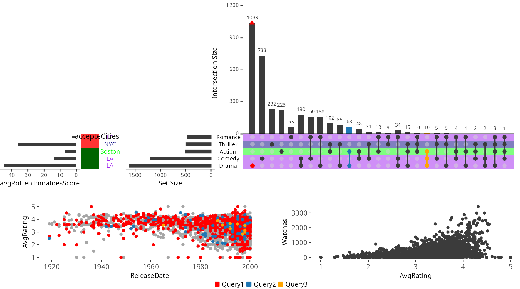 upset(movies, set.metadata = list(data = metadata, plots = list(list(type="hist", column="avgRottenTomatoesScore", assign=20), list(type="bool", column= "accepted", assign = 5, colors = c("#FF3333", "#006400")), list(type="text", column="Cities", assign=5, colors=c("Boston"="green","NYC"="navy","LA"="purple")), list(type="matrix_rows", column="Cities", colors=c("Boston"="green", "NYC"="navy", "LA"="purple"), alpha=0.5))), queries=list(list(query=intersects, params=list("Drama"), color="red", active=F), list(query=intersects, params=list("Action", "Drama"), active = T), list(query=intersects, params=list("Drama", "Comedy", "Action"), color="orange", active=T)), attribute.plots = list(gridrows=45, plots = list(list(plot=scatter_plot, x="ReleaseDate", y="AvgRating", queries=T), list(plot=scatter_plot, x="AvgRating", y="Watches", queries=F)), ncols=2), query.legend="bottom")