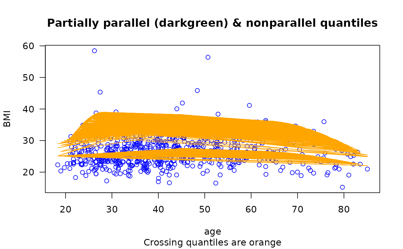 main = "Partially parallel (darkgreen) & nonparallel quantiles",