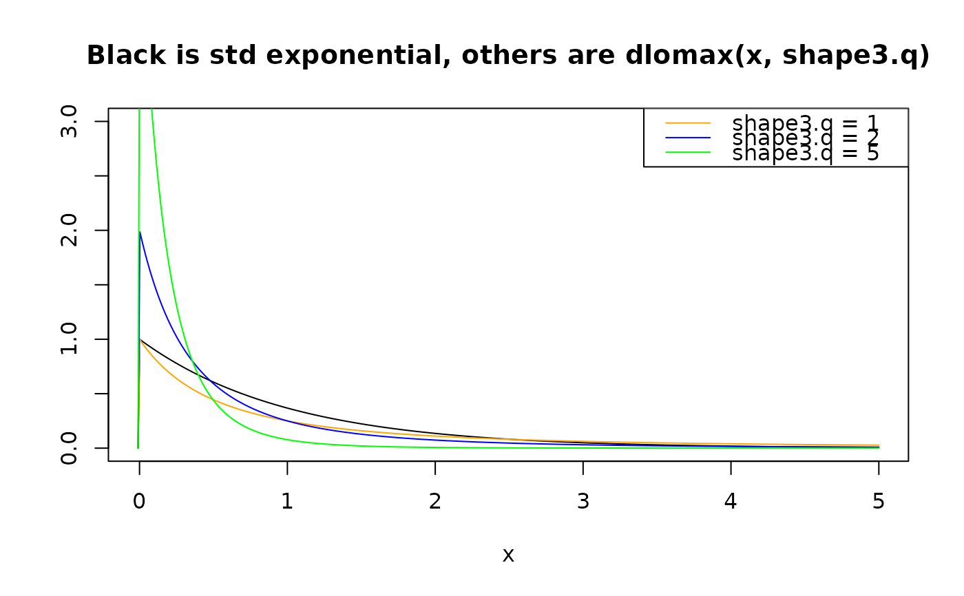 main = "Black is std exponential, others are dlomax(x, shape3.q)")