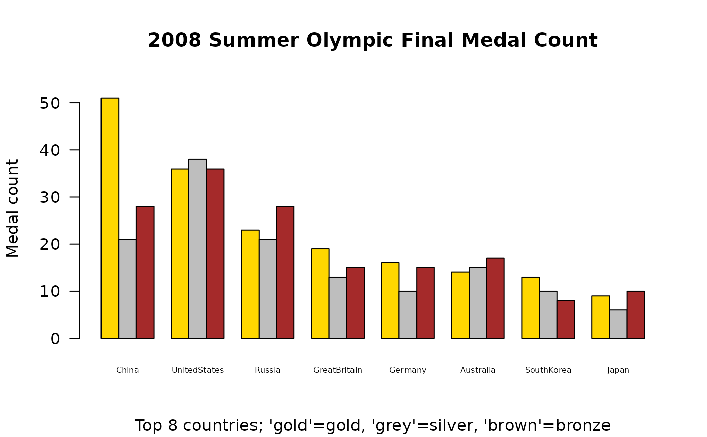beside = TRUE, main = "2008 Summer Olympic Final Medal Count",