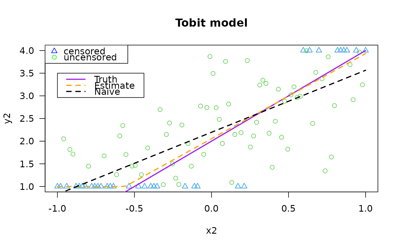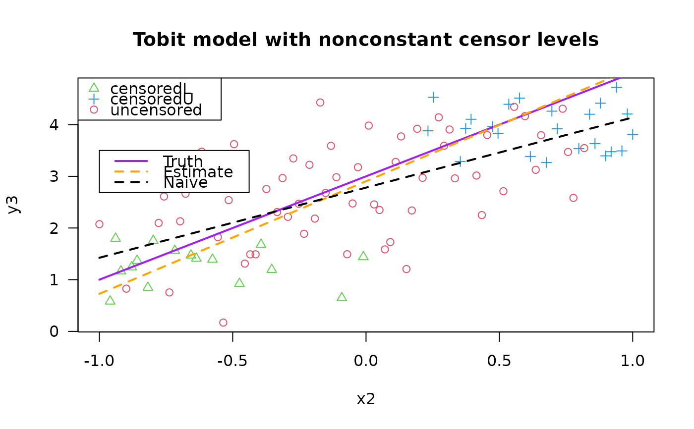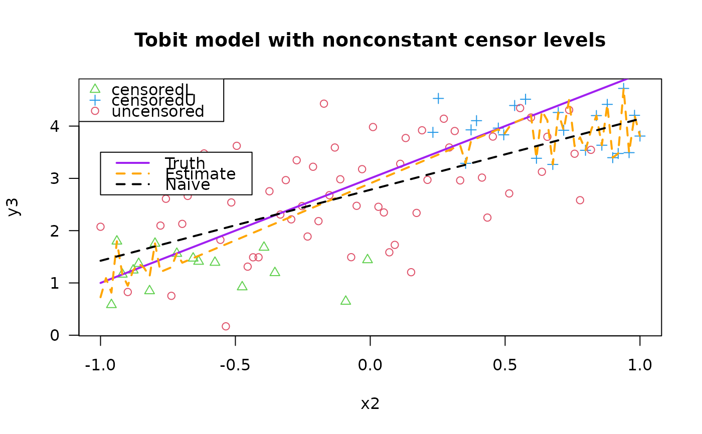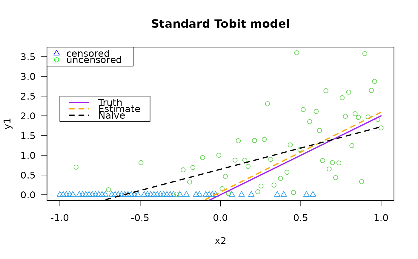 y1 = rtobit(nn, mean = meanfun1(x2)), # Standard Tobit model