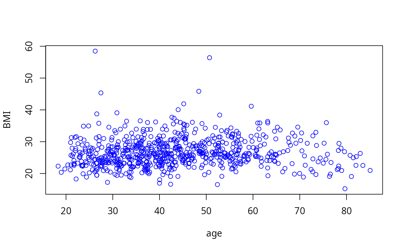 with(bmi.nz, plot(age, BMI, col = "blue"))