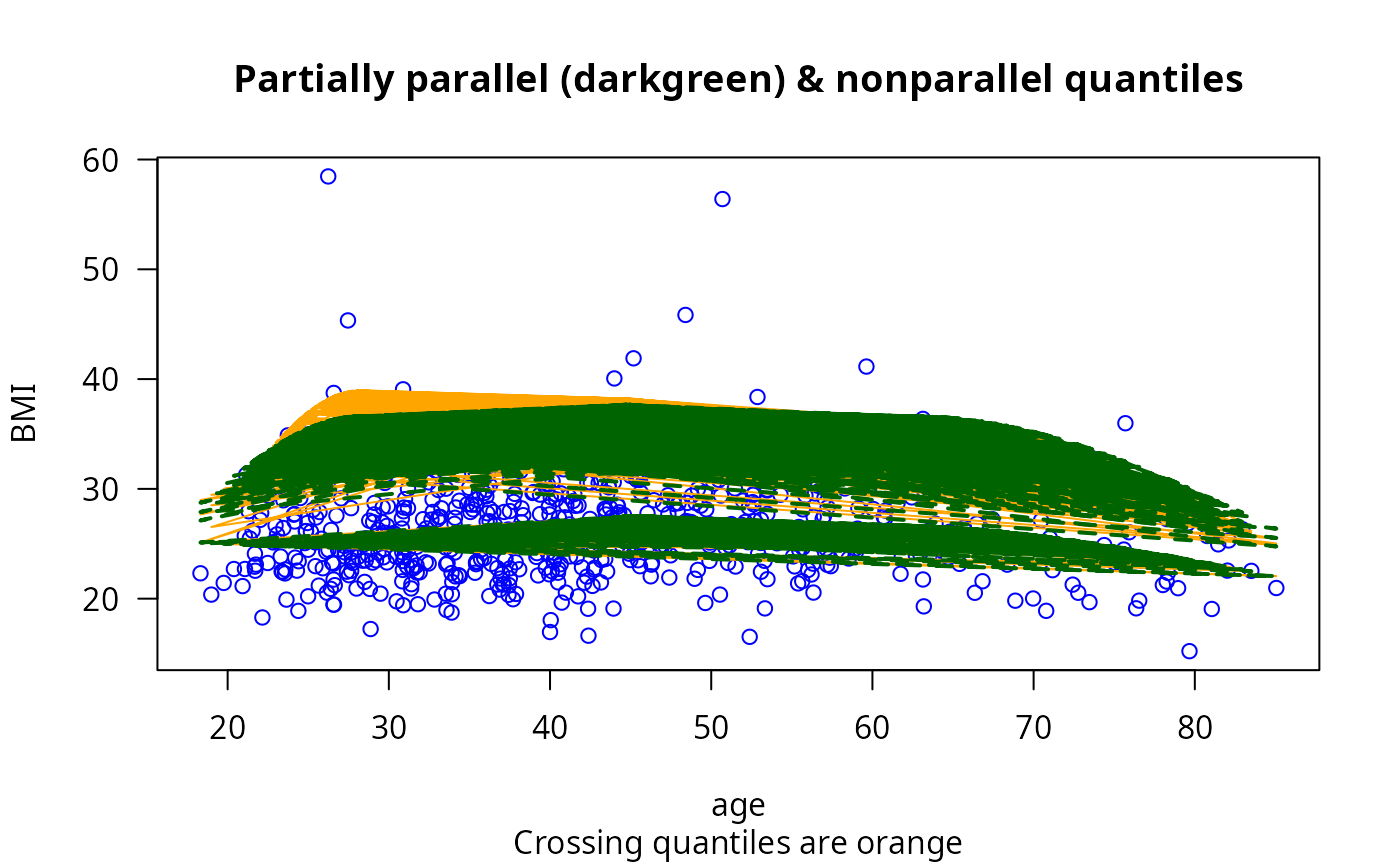 main = "Partially parallel (darkgreen) & nonparallel quantiles",