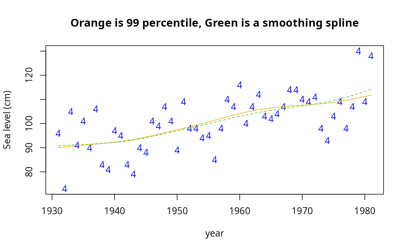 main = "Orange is 99 percentile, Green is a smoothing spline")