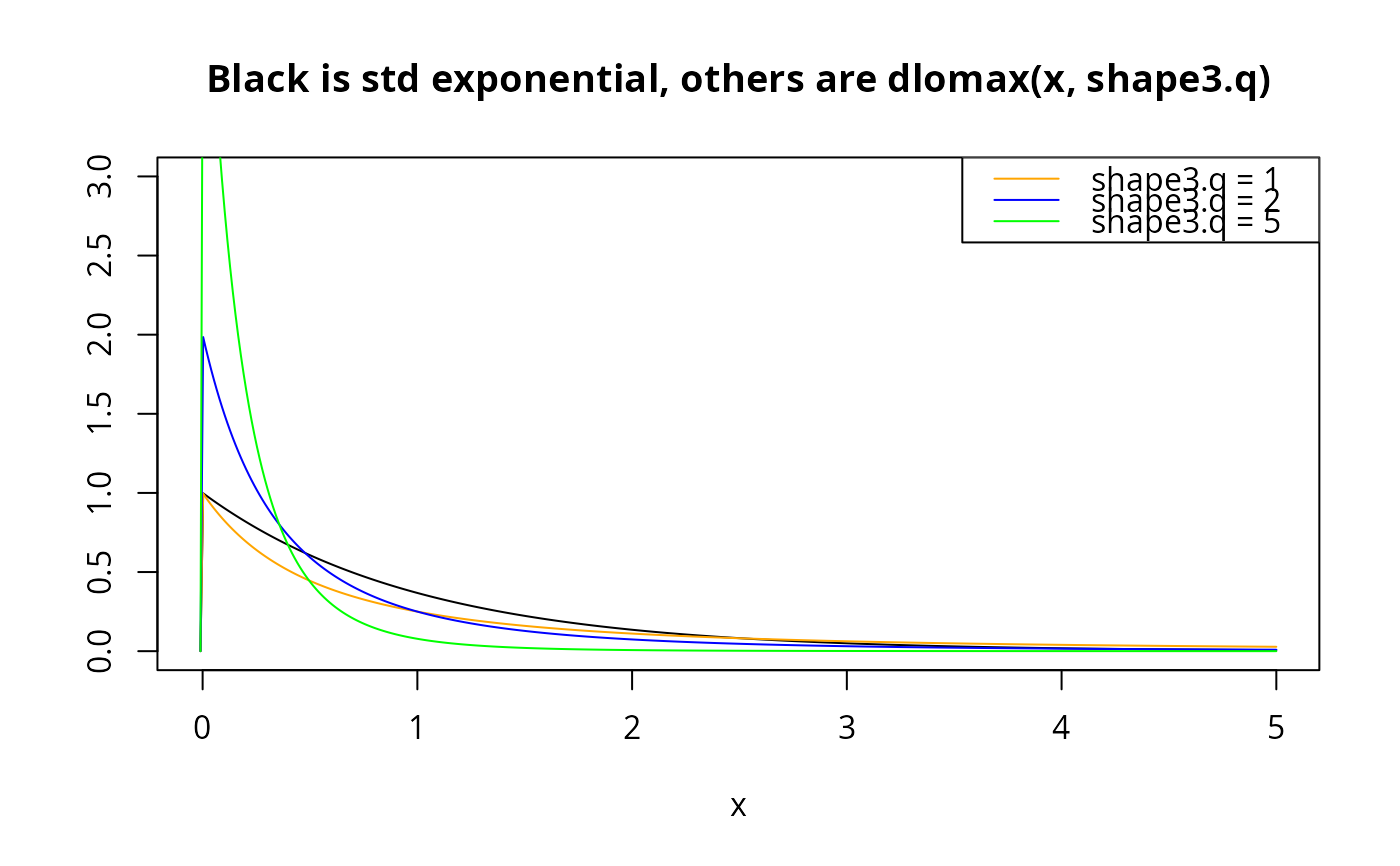 main = "Black is std exponential, others are dlomax(x, shape3.q)")