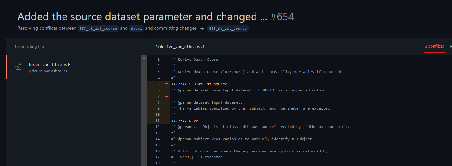 For simple merge conflicts, developers can make use of the GitHub interface to solve them. GitHub will show the number of conflicts between the two branches. In the below image, GitHub has found 3 conflicts, but we only display the first one. Just like in the terminal, GitHub will make use of the <<<<<<<, =======, and >>>>>>> to highlight the conflicting sections. You will need to make the decision on whether to keep the code from the base or the feature branch. Once you have decided, go into the code and remove the section you no longer wish to keep. Be sure to remove the <<<<<<<, =======, and >>>>>>> as well! Once you work through the conflicts you will mark as Resolved and Commit your changes. It is recommended to pull your branch back down to RStudio to make sure no untoward effects have happen to your branch.