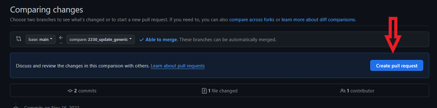 In GitHub, under Pull requests, the user will either have a “Compare and pull request” button and/or a “Create Pull Request”. The first button will be created for you if GitHub detects recent changes you have made. The branch to merge with must be the main branch (base = main) and the compare branch is the new branch to merge - as shown in the below picture. Please pay close attention to the branch you are merging into!