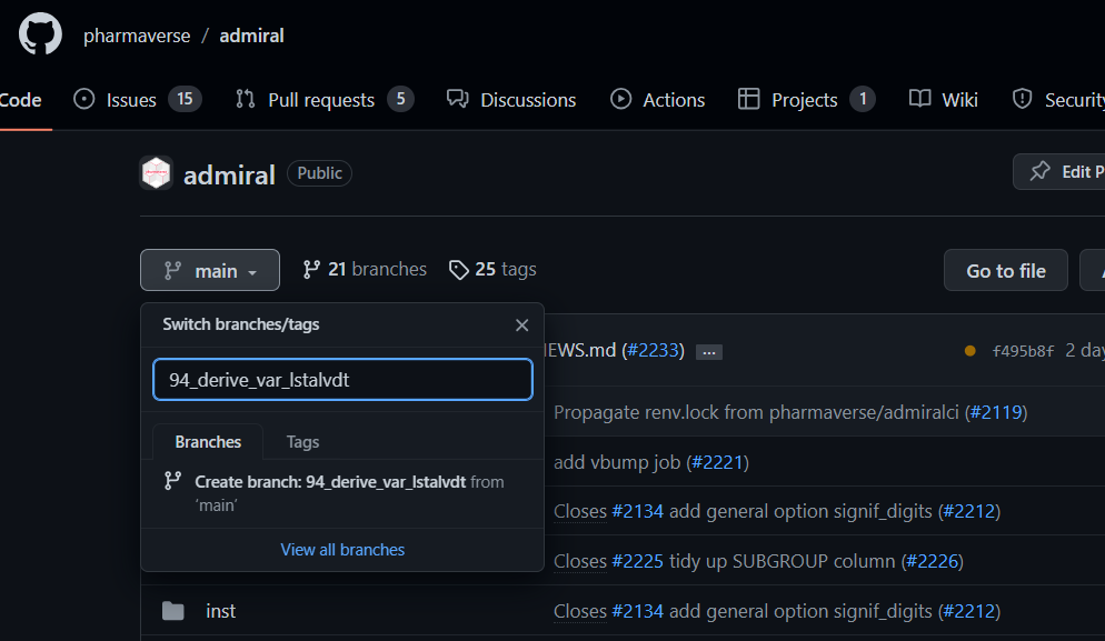 The name of the branch must be prefixed with the issue number, followed by a short but meaningful description. As an example, given an issue #94 “Program function to derive LSTALVDT”, the branch name would be 94_derive_var_lstalvdt.