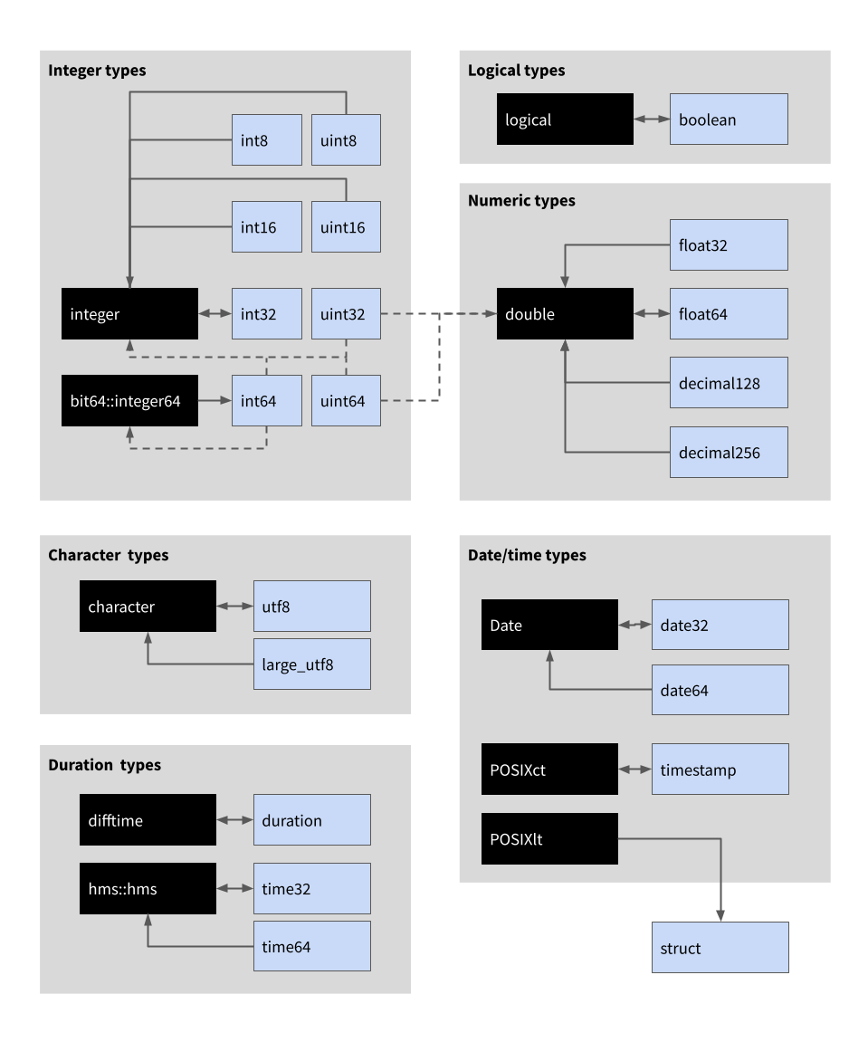 In this image, black boxes refer to R data types and light blue boxes refer to Arrow data types. Directional arrows specify conversions (e.g., the bidirectional arrow between the logical R type and the boolean Arrow type means that the logical R converts to an Arrow boolean and vice versa). Solid lines indicate that this conversion rule is always the default; dashed lines mean that it only sometimes applies (the rules and special cases are described below).