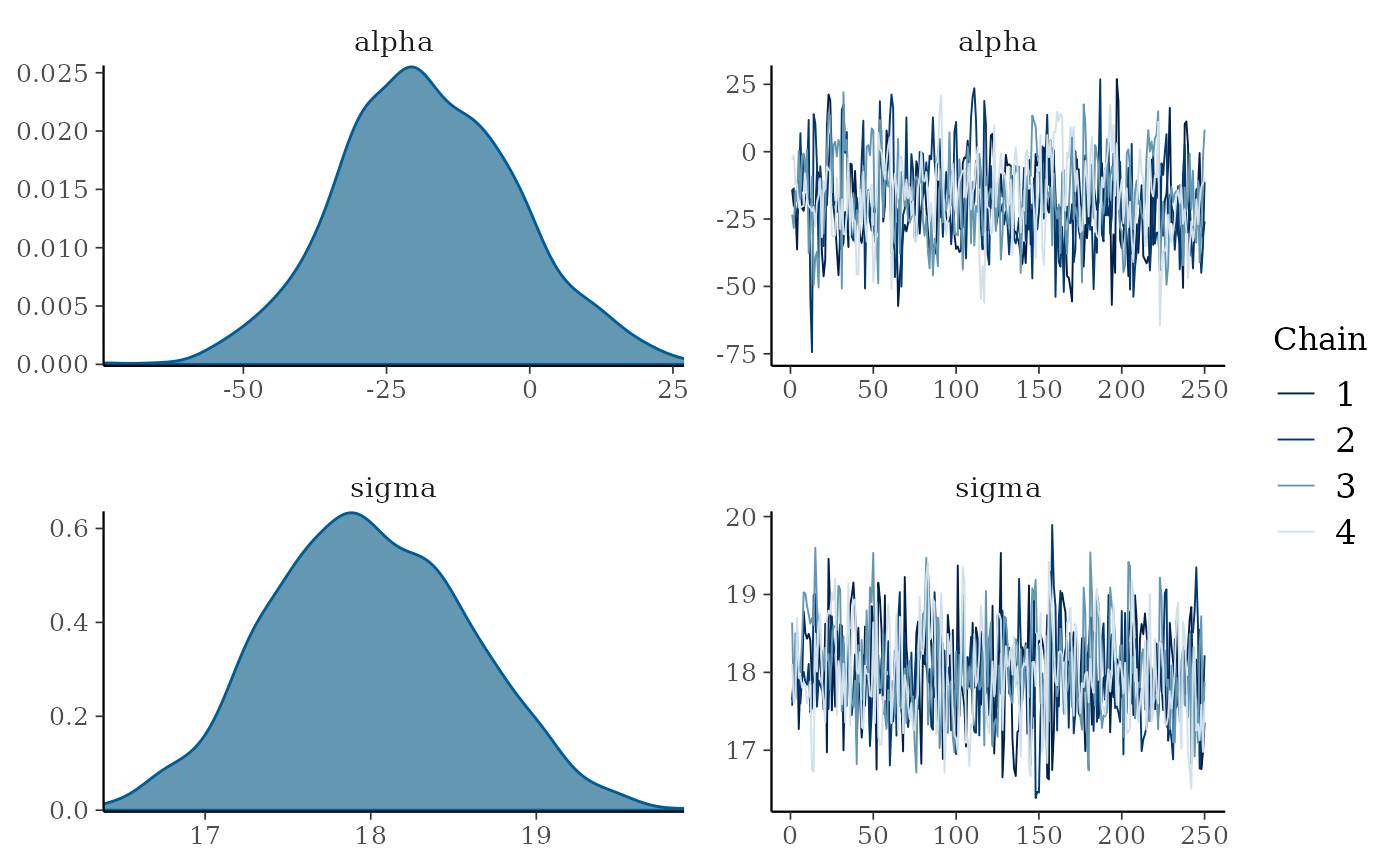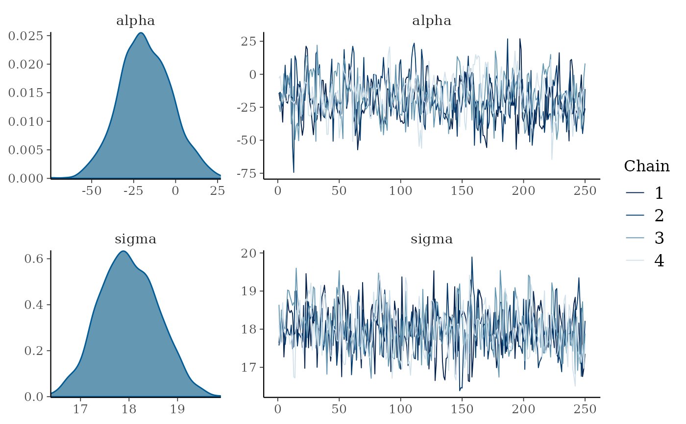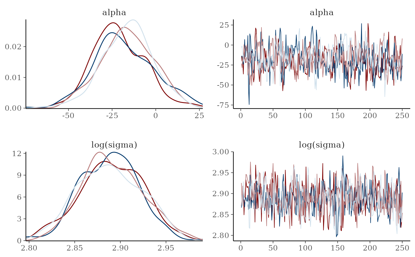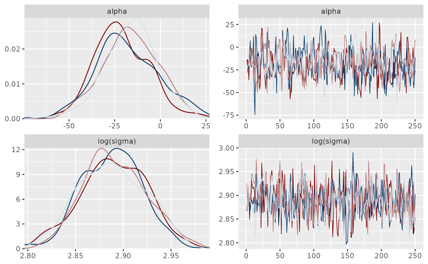 mcmc_combo(x, pars = c("alpha", "sigma"), widths = c(1, 2))