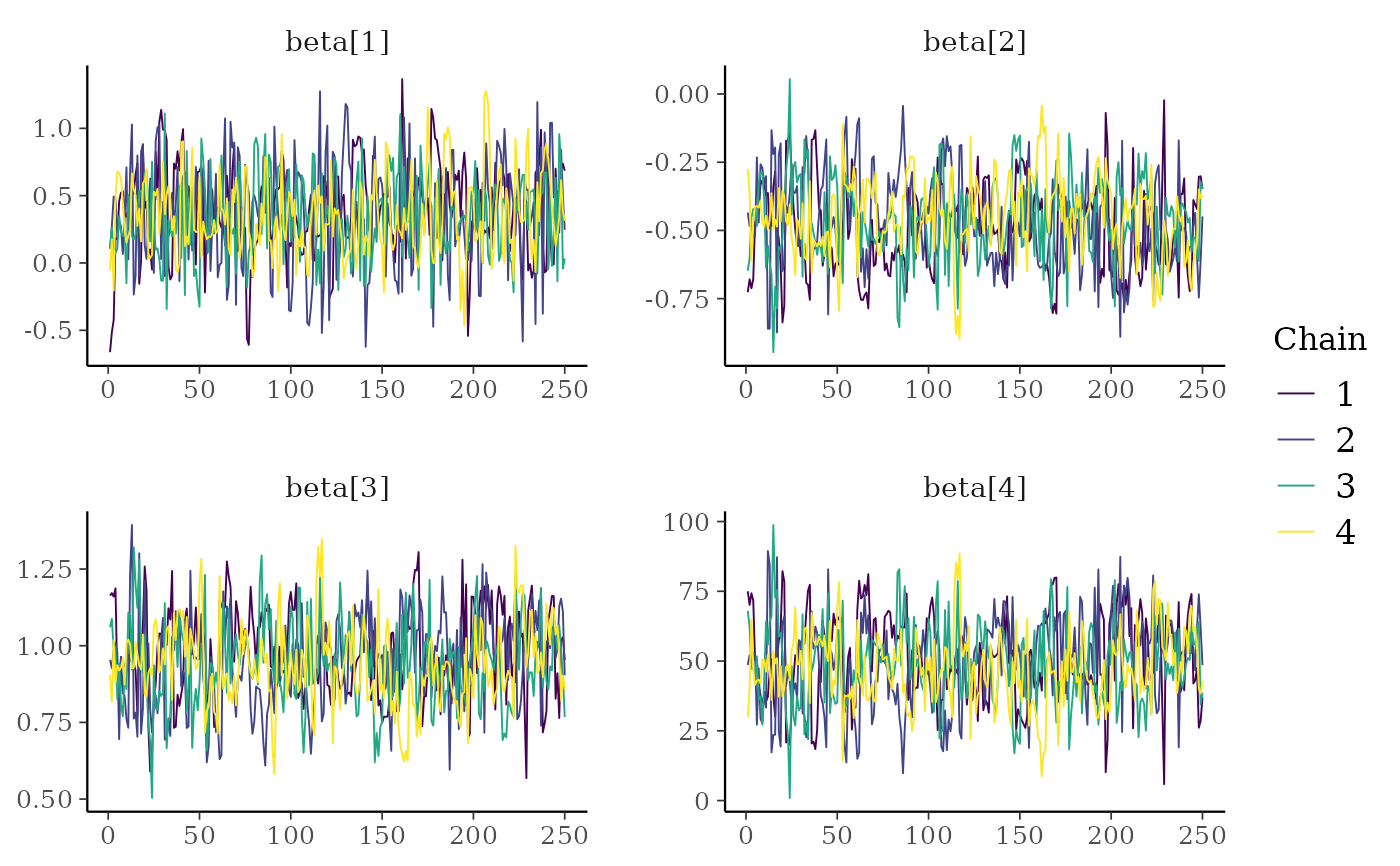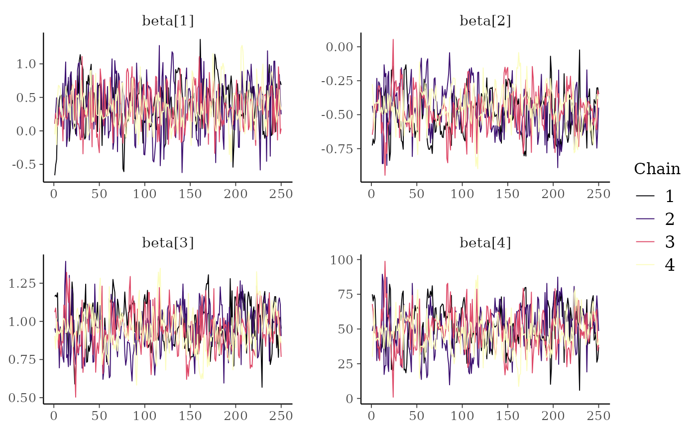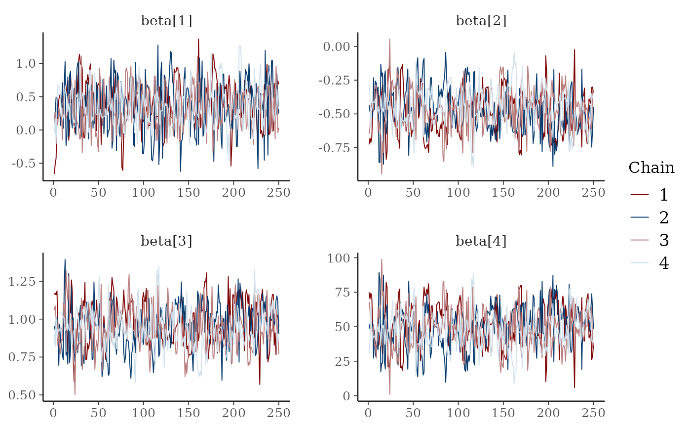 mcmc_trace()Standard trace plots of MCMC draws. For models fit using NUTS,