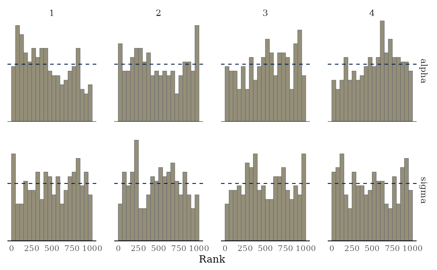 mcmc_rank_hist(x, pars = c("alpha", "sigma"), ref_line = TRUE)