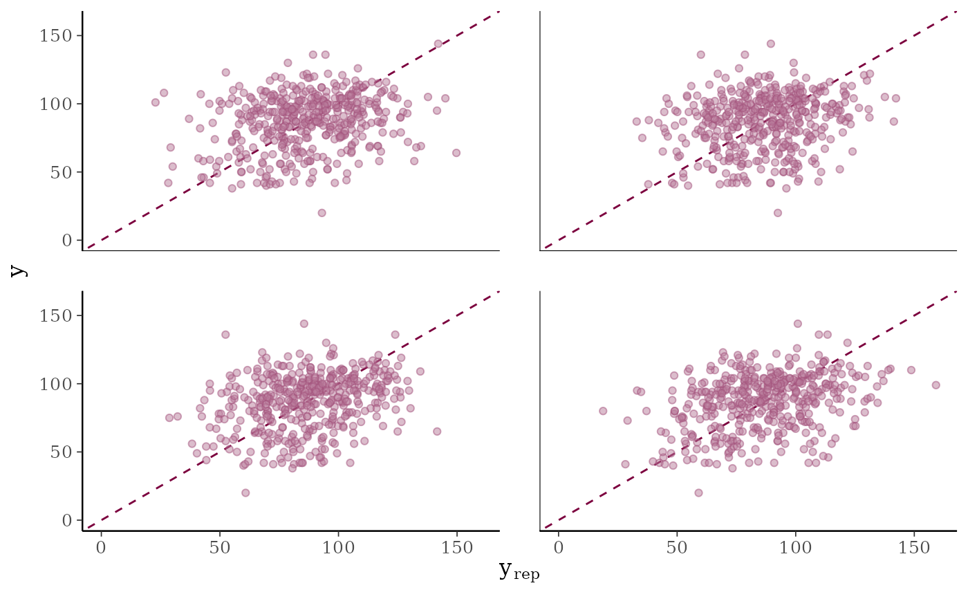 p2 <- ppc_scatter(y, yrep[20:23, ], alpha = 0.5, size = 1.5)
