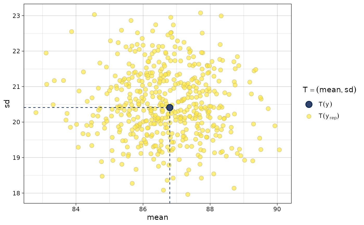 ppc_stat_2d(y, yrep, stat = c("mean", "sd"), ..., size = 2.5, alpha = 0.7)