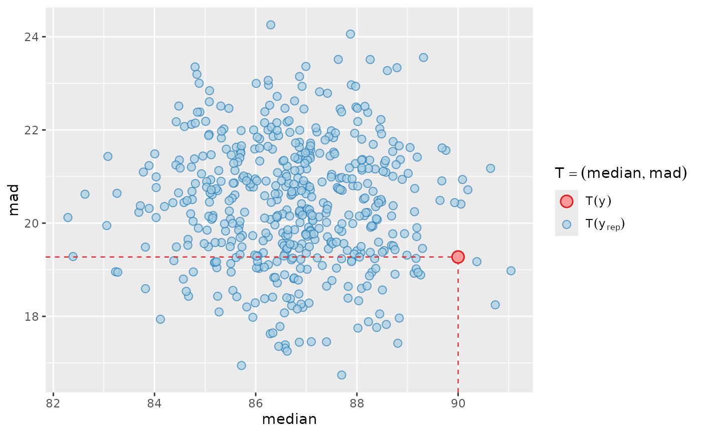 ppc_stat_2d()A scatterplot showing the joint distribution of two statistics