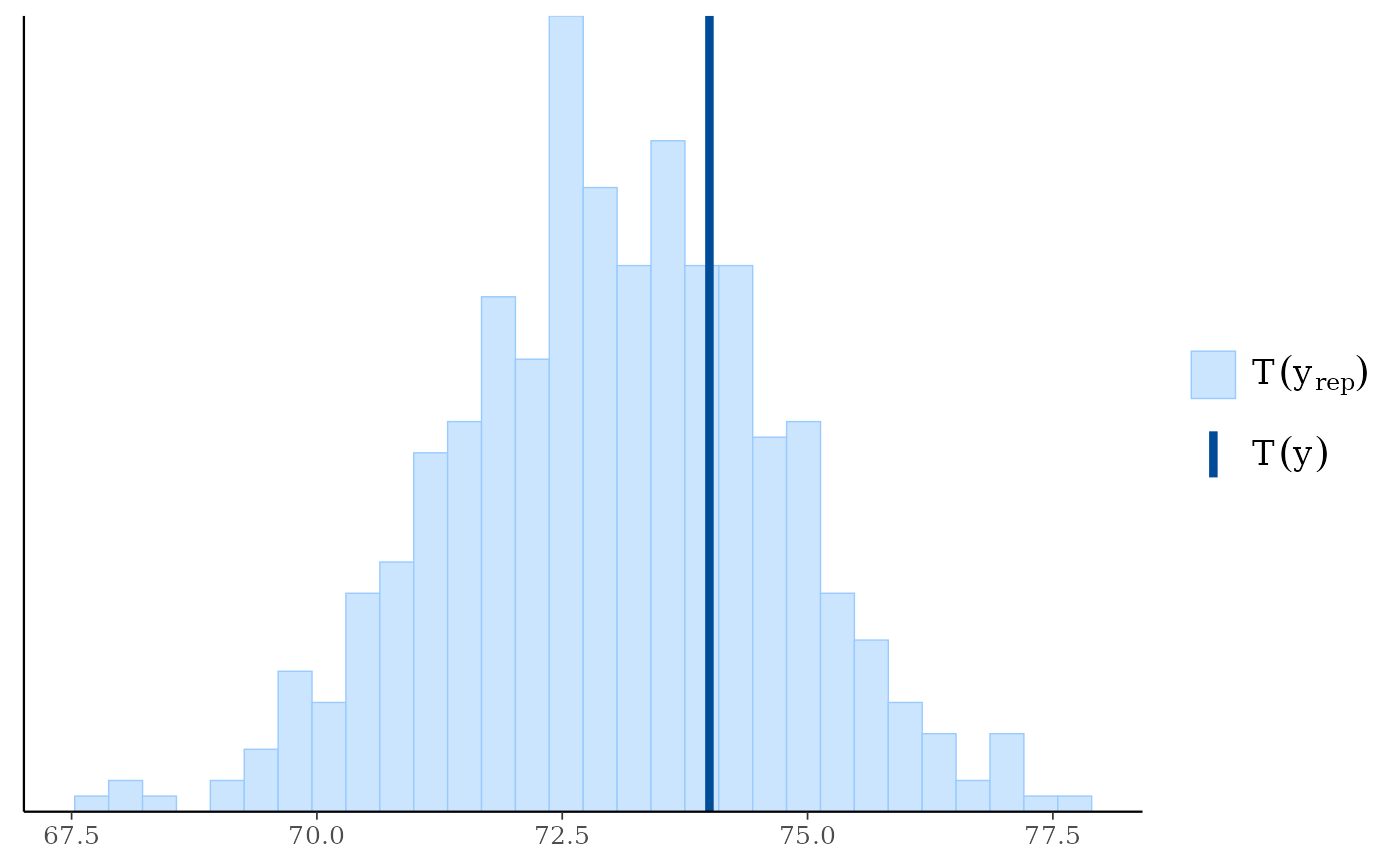NOTE: Although the default test statistic is the mean, this is unlikely to detect anything interesting in most cases. In general we recommend using some other test statistic as discussed in Section 5 of Gabry et al. (2019).