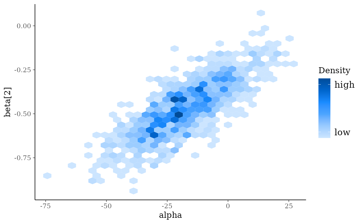 mcmc_hex(x, pars = vars(alpha, `beta[2]`))