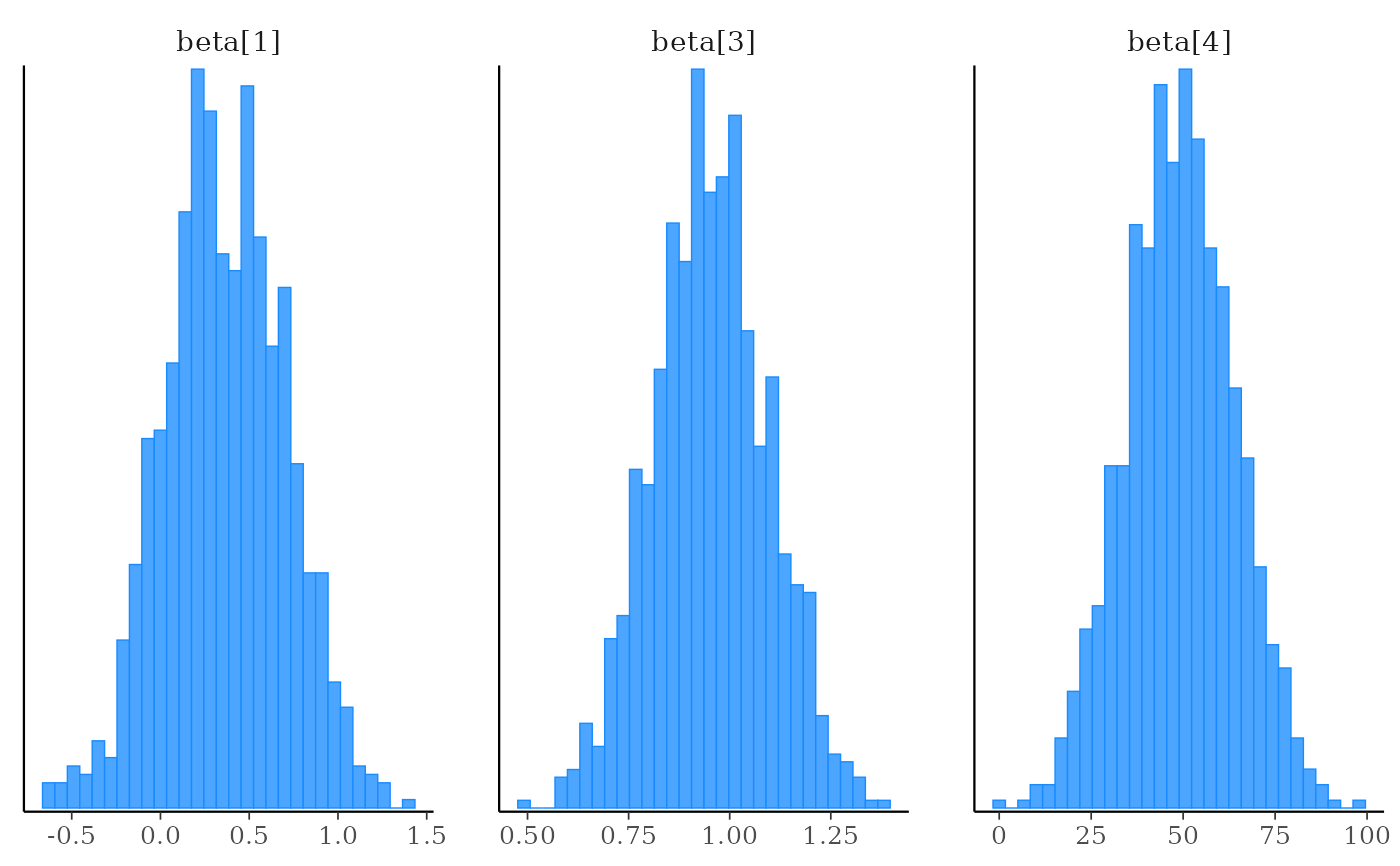mcmc_hist(x, pars = vars(param_range("beta", c(1, 3, 4))))