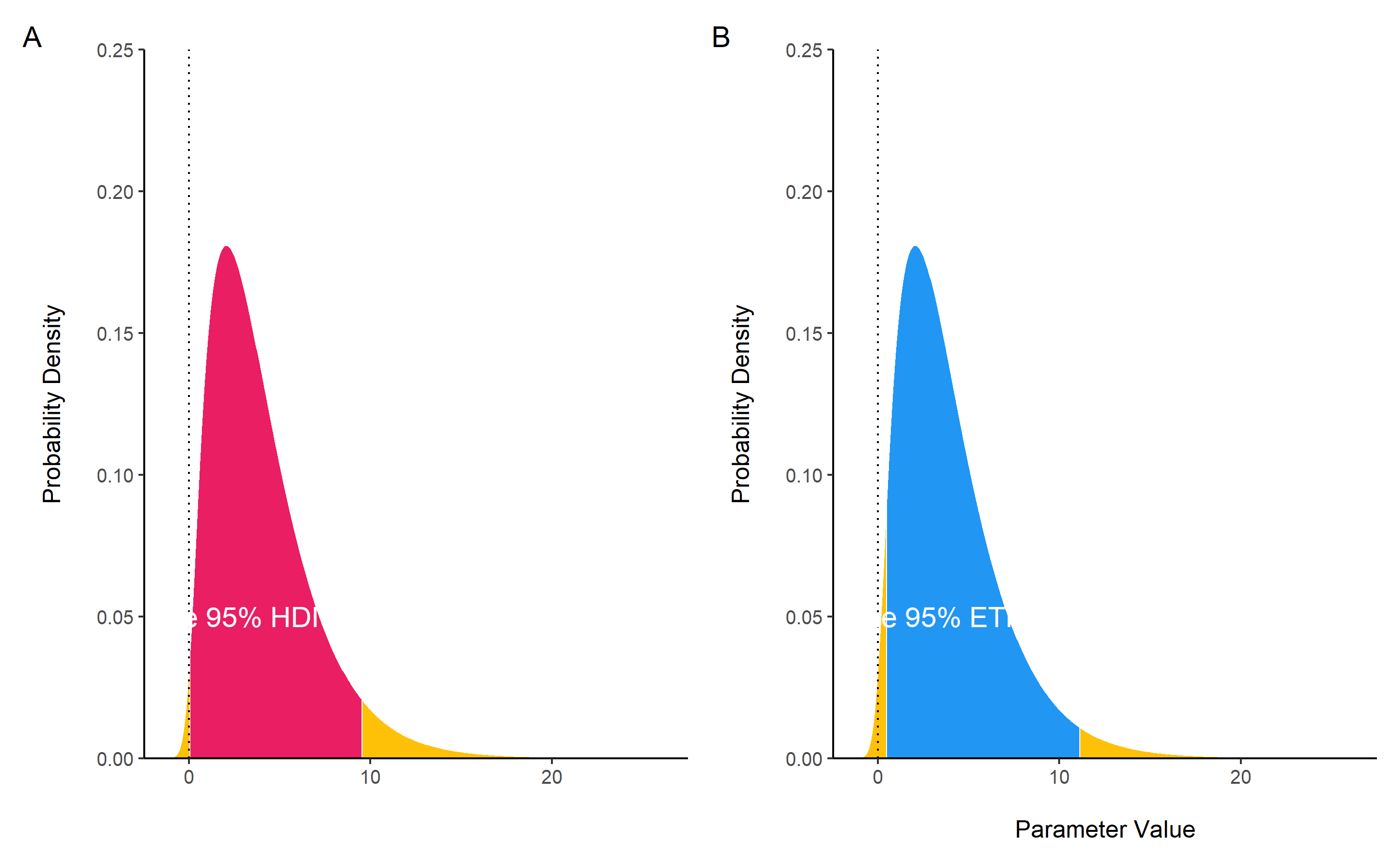 Unlike equal-tailed intervals (see eti()) that typically exclude 2.5% from each tail of the distribution, the HDI is not equal-tailed and therefore always includes the mode(s) of posterior distributions.