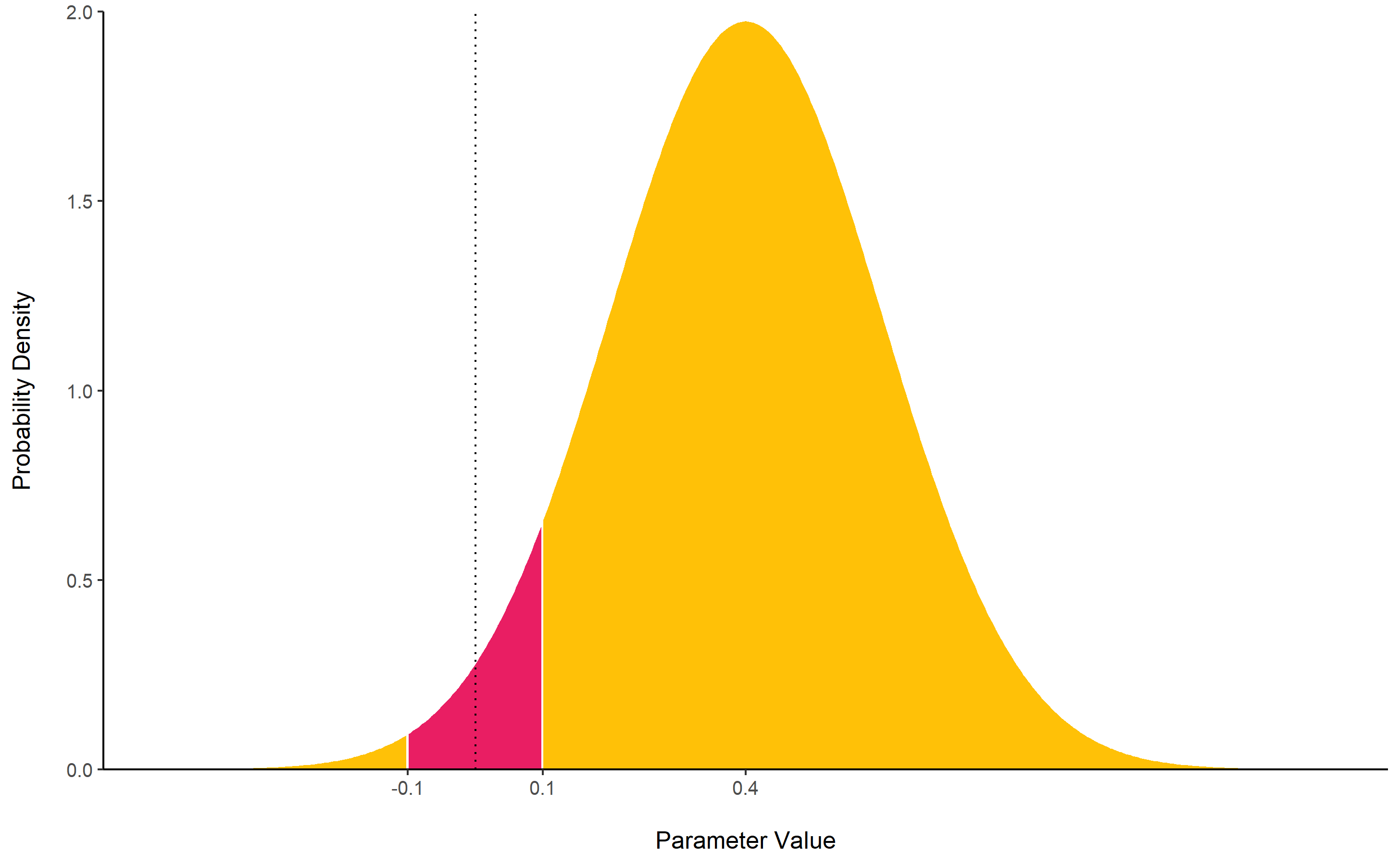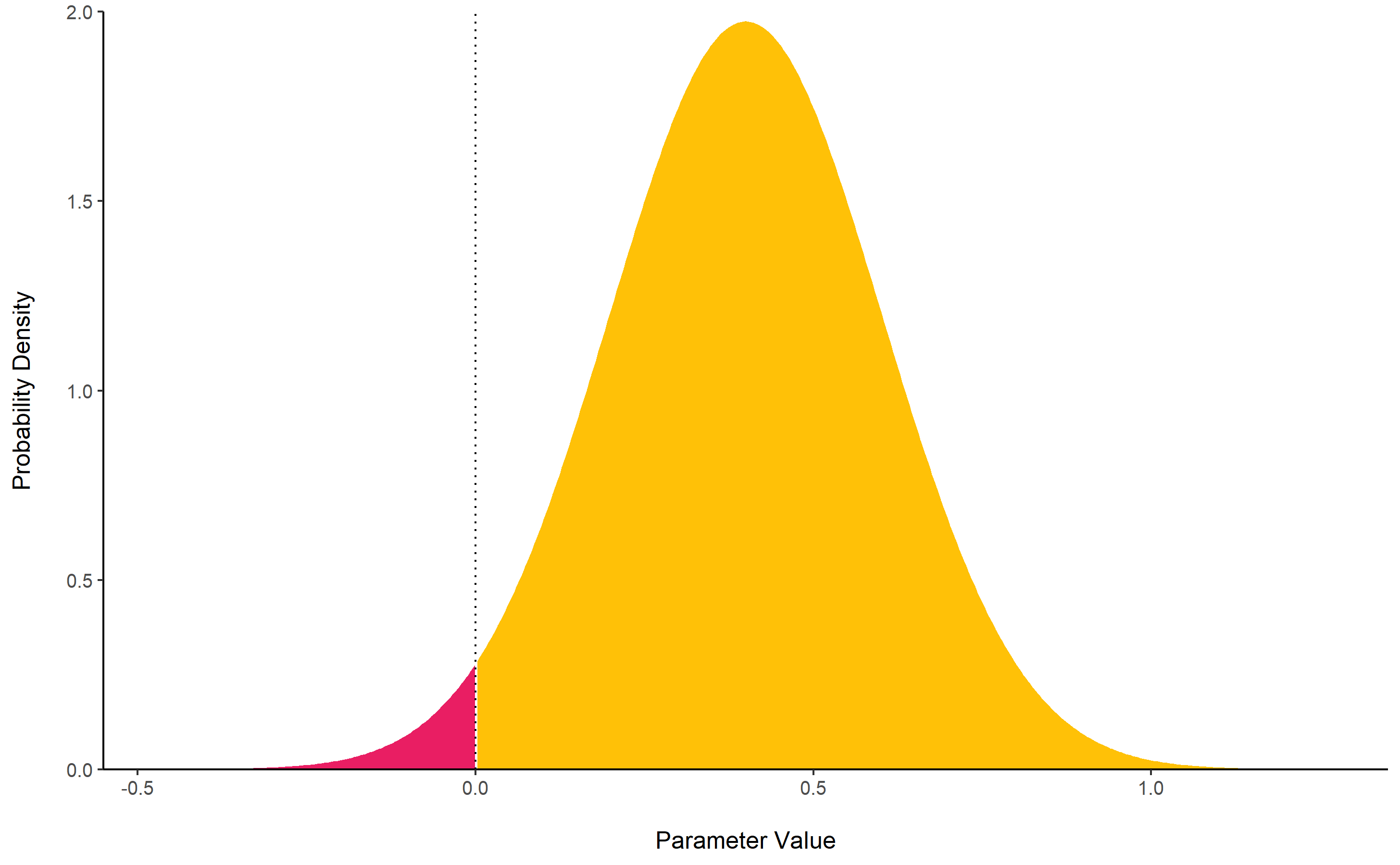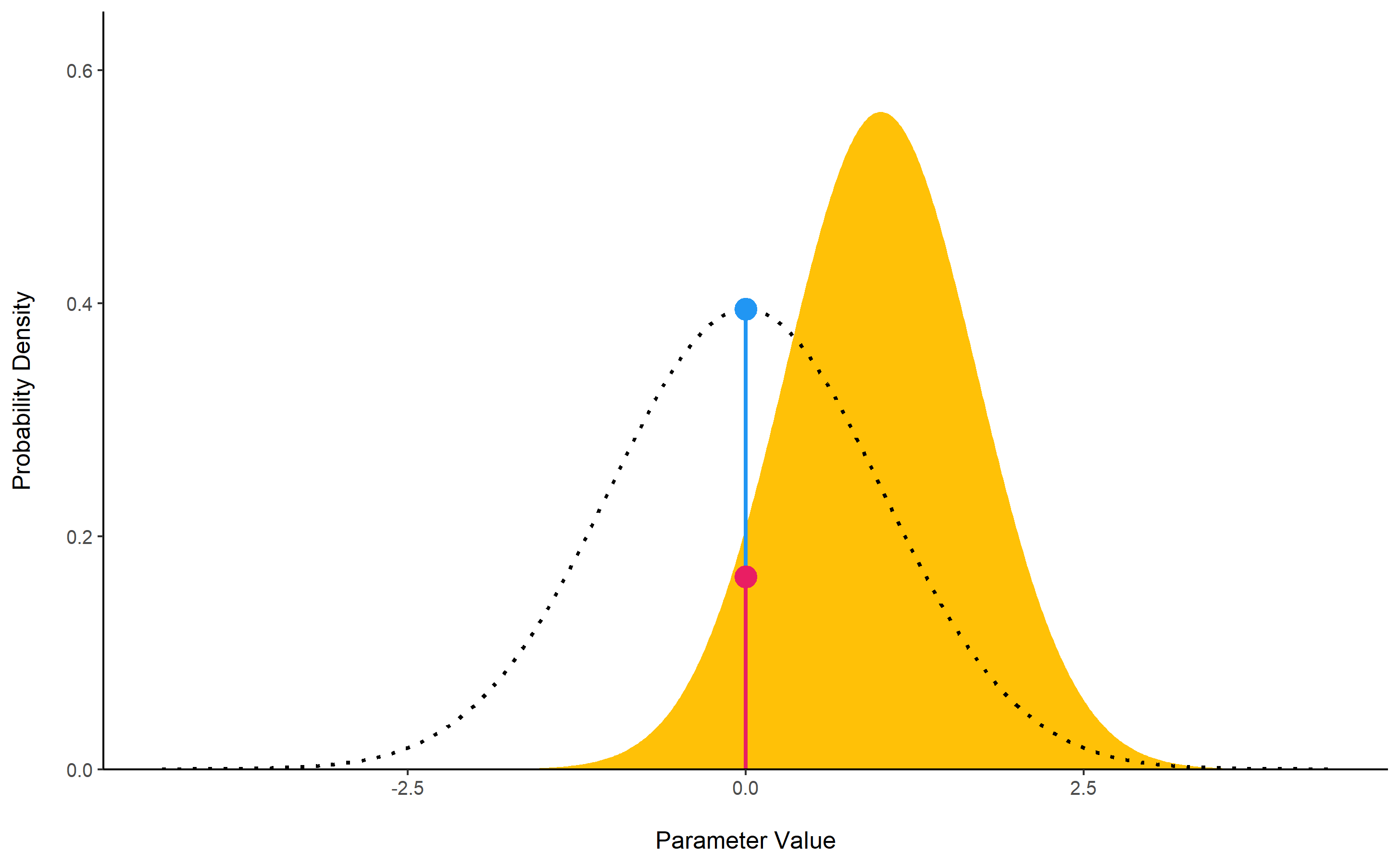 The lollipops represent the density of a point-null on the prior distribution (the blue lollipop on the dotted distribution) and on the posterior distribution (the red lollipop on the yellow distribution). The ratio between the two - the Savage-Dickey ratio - indicates the degree by which the mass of the parameter distribution has shifted away from or closer to the null.