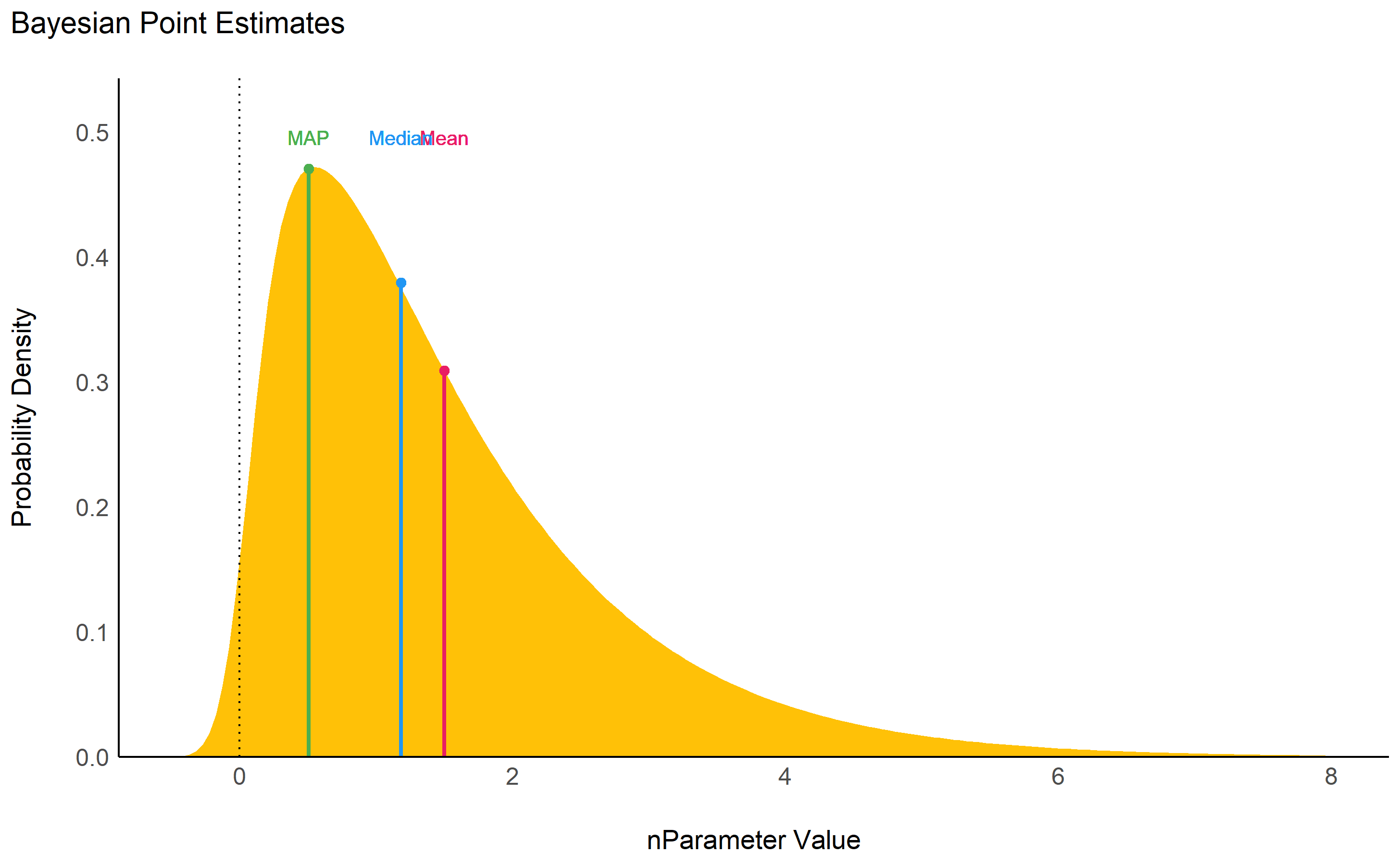 In the Bayesian framework, parameters are estimated in a probabilistic fashion as distributions. These distributions can be summarised and described by reporting four types of indices: