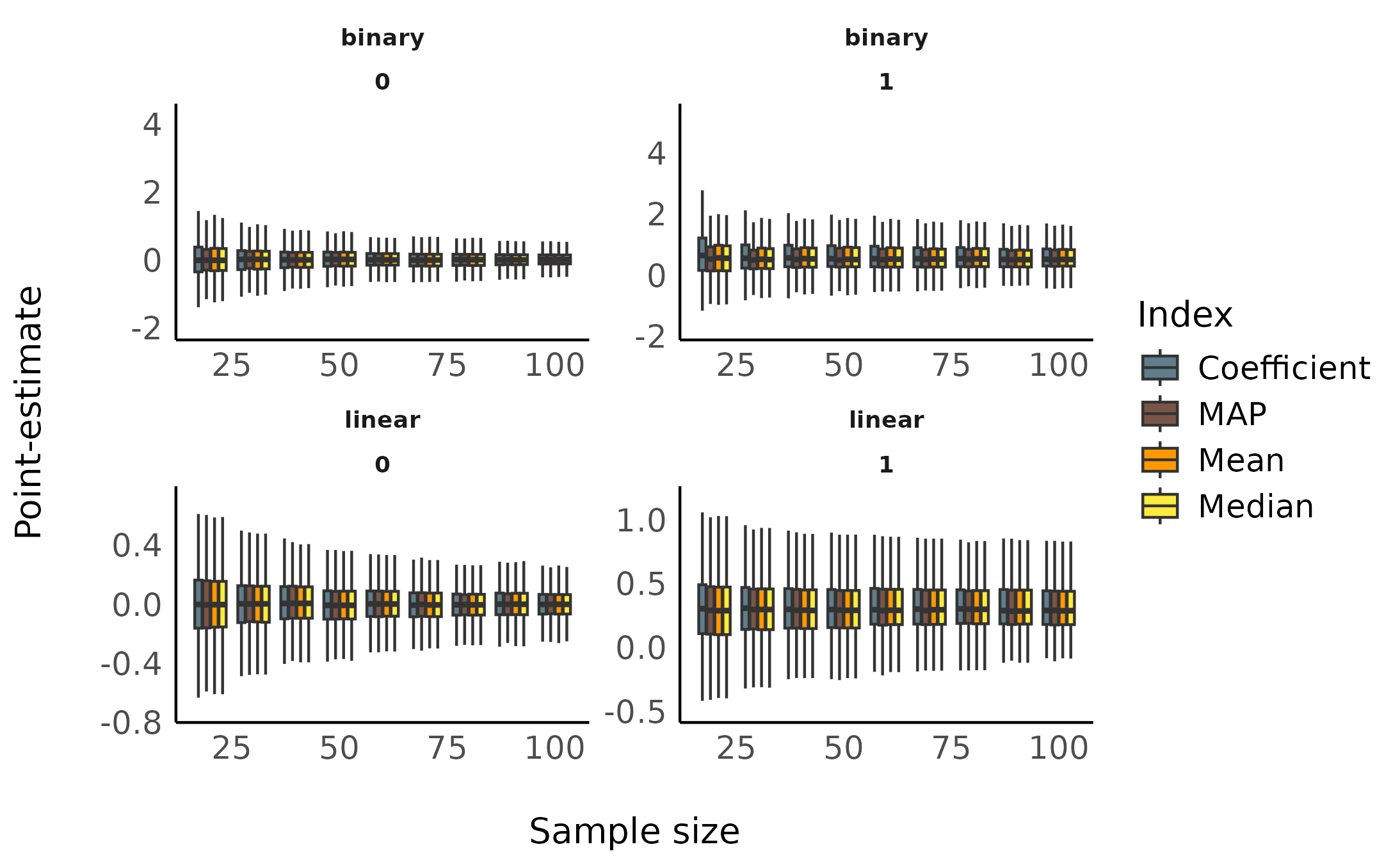 dat <- data_select(dat, select = c("sample_size", "true_effect", "outcome_type", "Coefficient", "Median", "Mean", "MAP"))