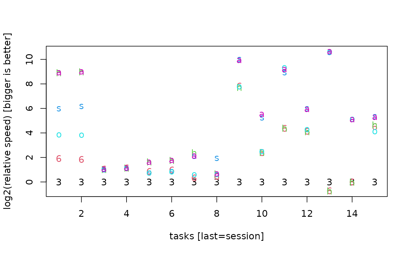 , ylab="log2(relative speed) [bigger is better]"