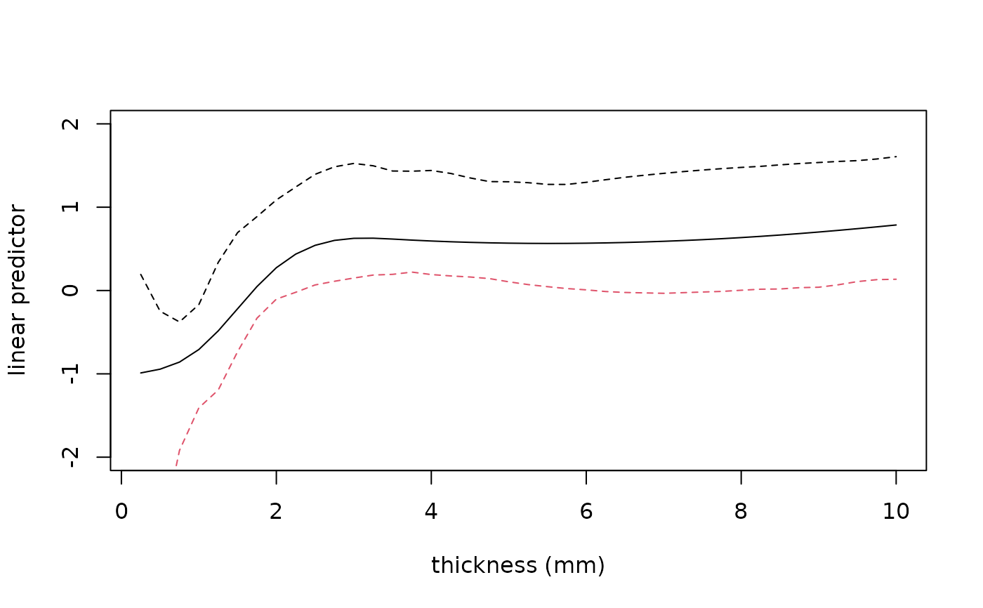 xlab = "thickness (mm)", ylab = "linear predictor", type = "n")