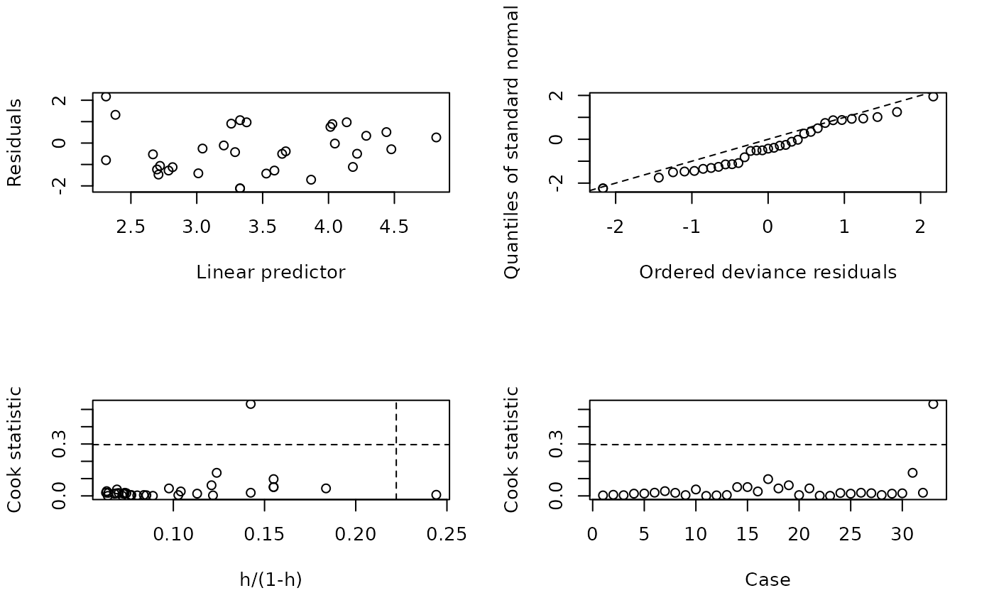 glm.diag.plots.RdMakes plot of jackknife deviance residuals against linear predictor, normal scores plots of standardized deviance residuals, plot of approximate Cook statistics against leverage/(1-leverage), and case plot of Cook statistic.