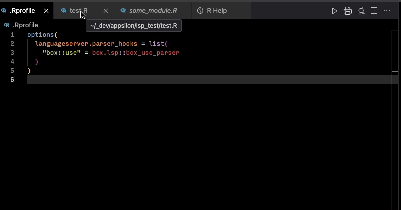 box.lsp::use_box_lsp() to configure your project’s .Rprofile file..Rprofile.Imports and Suggests packages are installed.R_LANGSVR_LOG=./lsp.log in .Renviron to start logging.Rprofile and .Renviron.devtools::load_all() to load all development functions.box_use_parser()