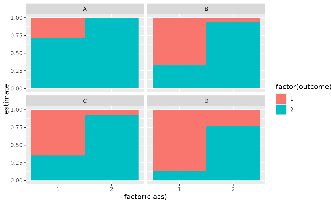 ggplot(tidy(M1), aes(factor(class), estimate, fill = factor(outcome))) +