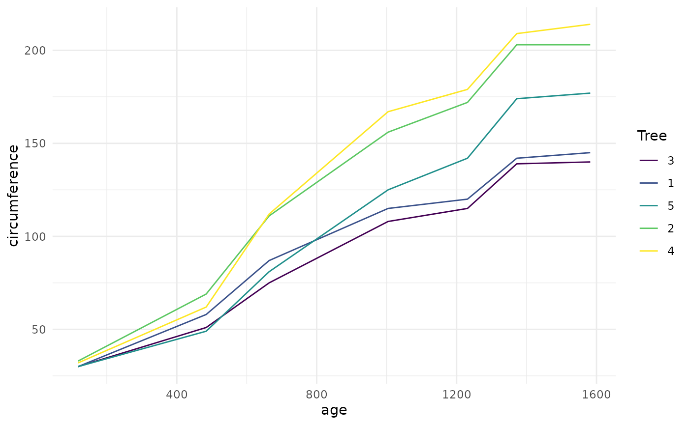theme_set(theme_minimal())Let’s try this on a simple dataset, the built-in Orange. We start by coercing Orange to a tibble. This gives a nicer print method that will especially useful later on when we start working with list-columns.
