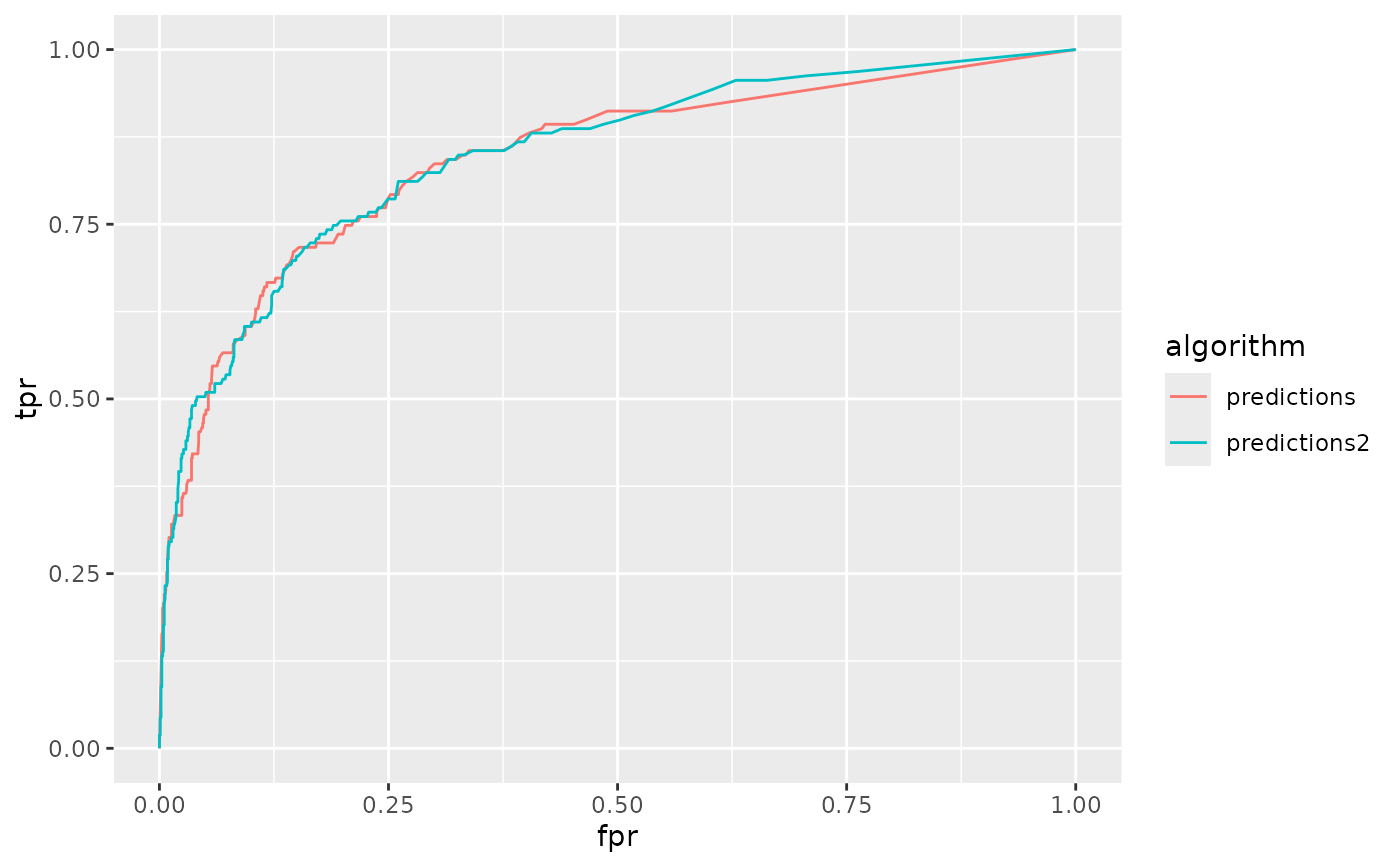 ggplot(rocs, aes(fpr, tpr, color = algorithm)) +