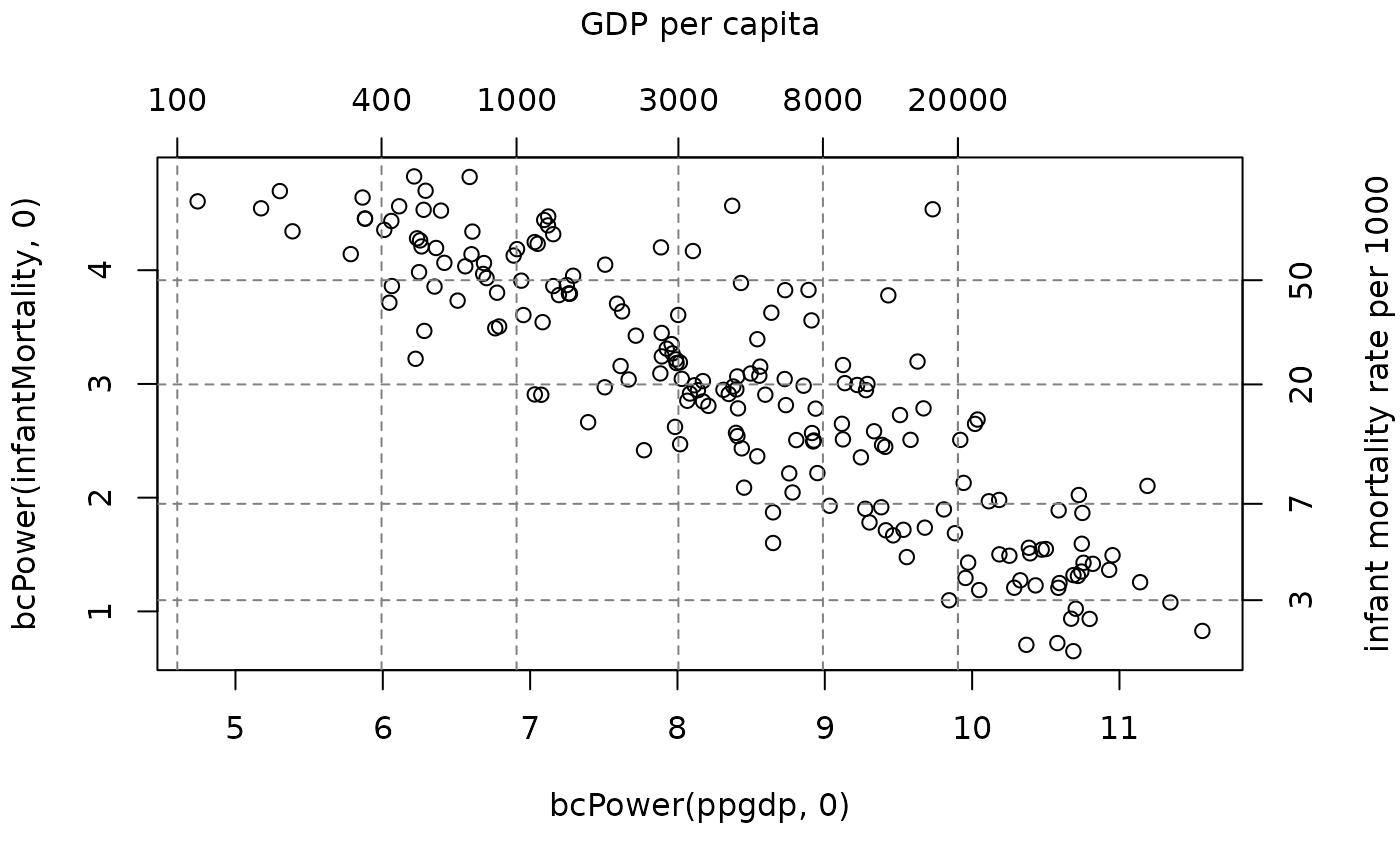 with(UN, plot(bcPower(ppgdp, 0), bcPower(infantMortality, 0)))