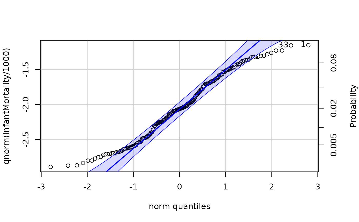 with(UN, qqPlot(qnorm(infantMortality/1000)))