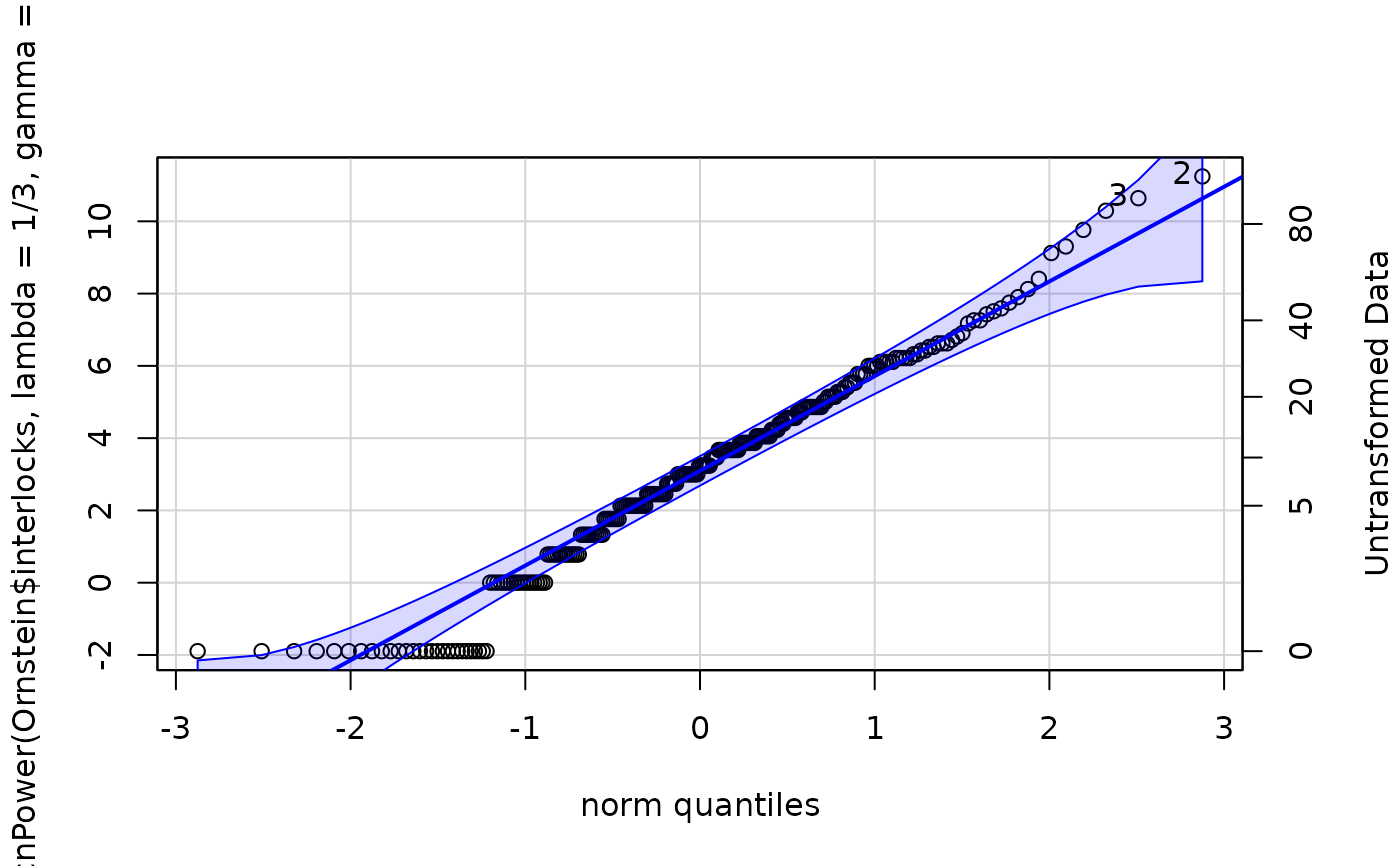 qqPlot(bcnPower(Ornstein$interlocks, lambda=1/3, gamma=0.1))