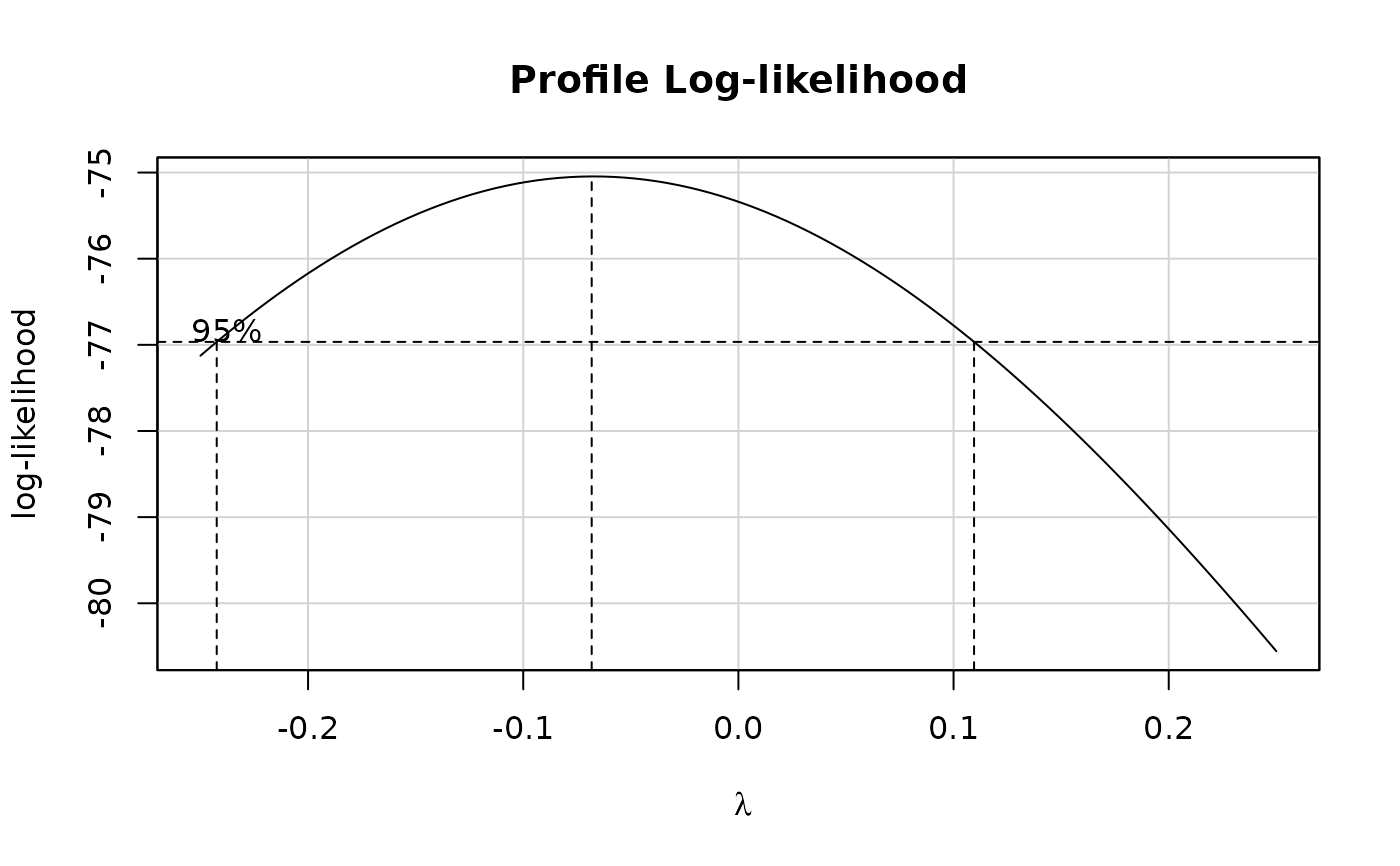 boxCox(object, lambda = seq(-2, 2, 1/10), plotit = TRUE, ...)