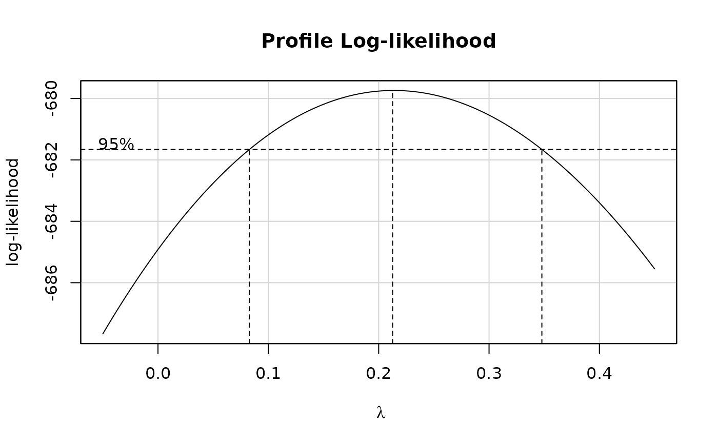 vector of values of \(\lambda\), with default (-2, 2) in steps of 0.1, where the profile log-likelihood will be evaluated.