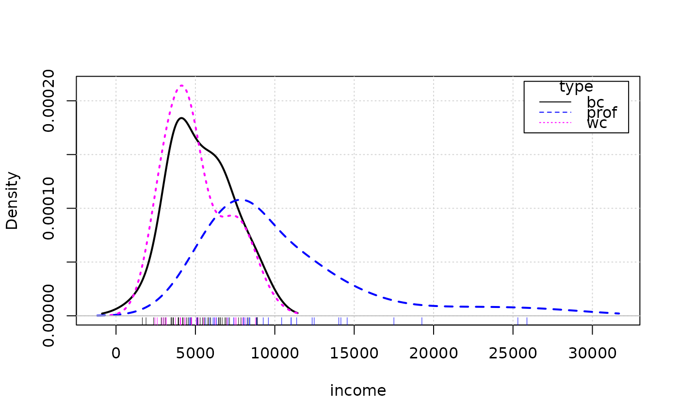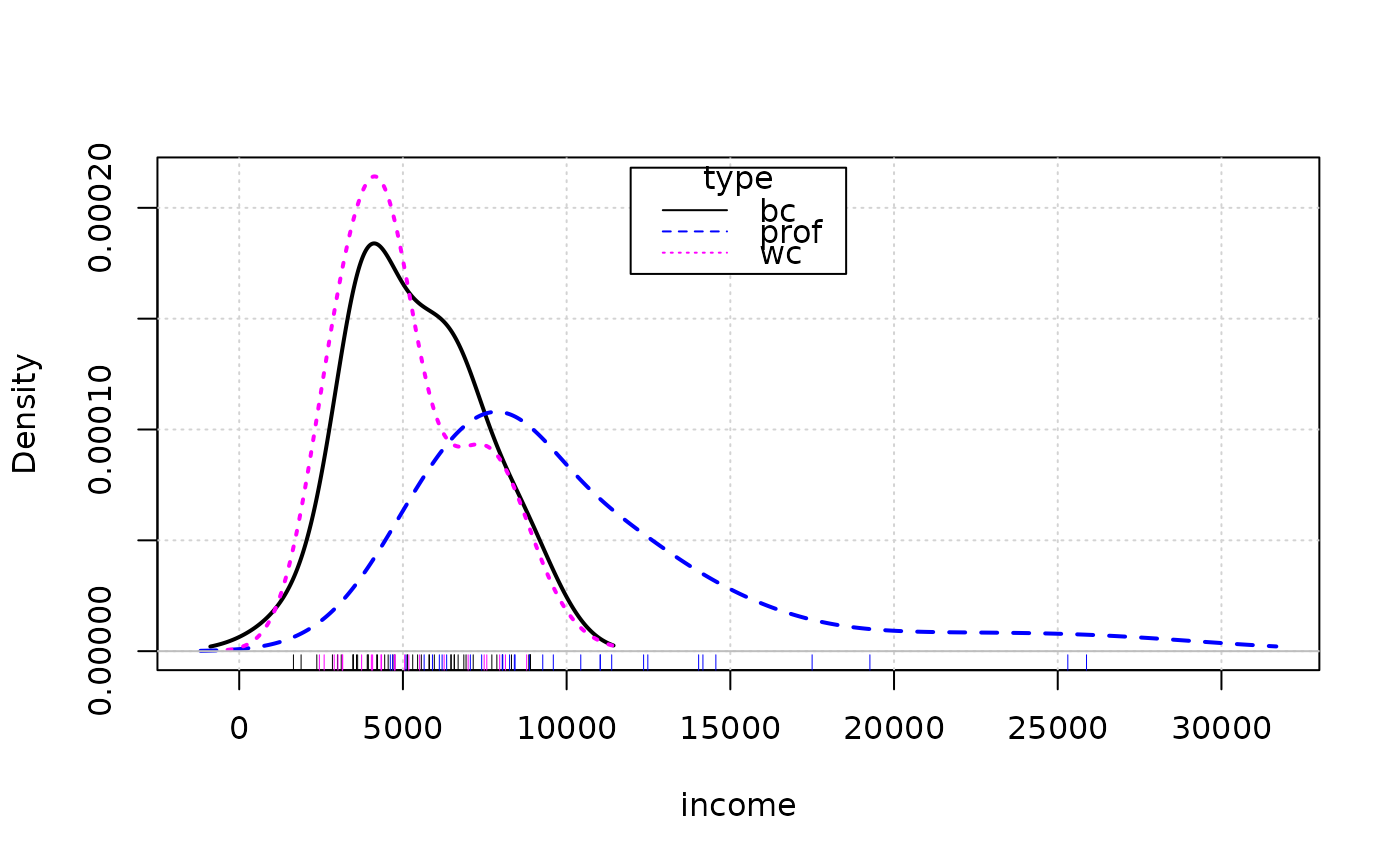 densityPlot(income ~ type, kernel=depan, legend=list(location="top"), data=Prestige)