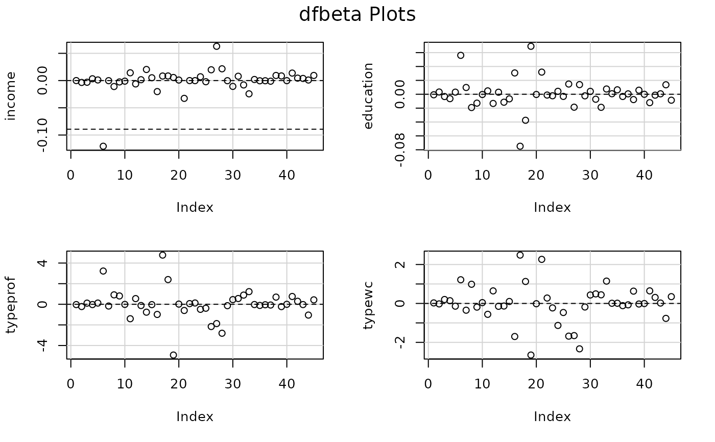 dfbetaPlots.RdThese functions display index plots of dfbeta (effect on coefficients of deleting each observation in turn) and dfbetas (effect on coefficients of deleting each observation in turn, standardized by a deleted estimate of the coefficient standard error). In the plot of dfbeta, horizontal lines are drawn at 0 and +/- one standard error; in the plot of dfbetas, horizontal lines are drawn and 0 and +/- 1.