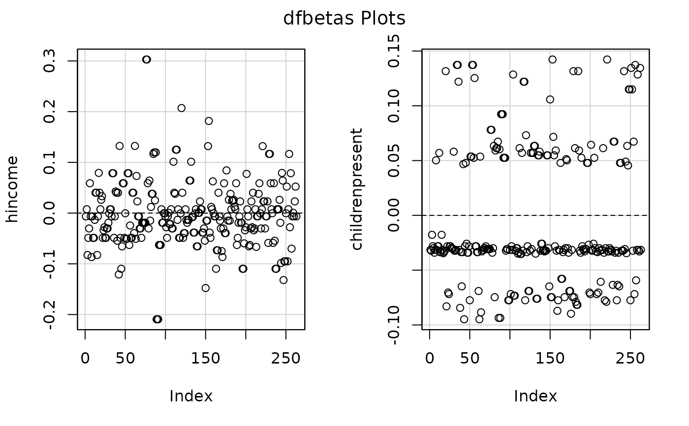 dfbetasPlots(model, terms=~., intercept=FALSE, layout=NULL, ask,