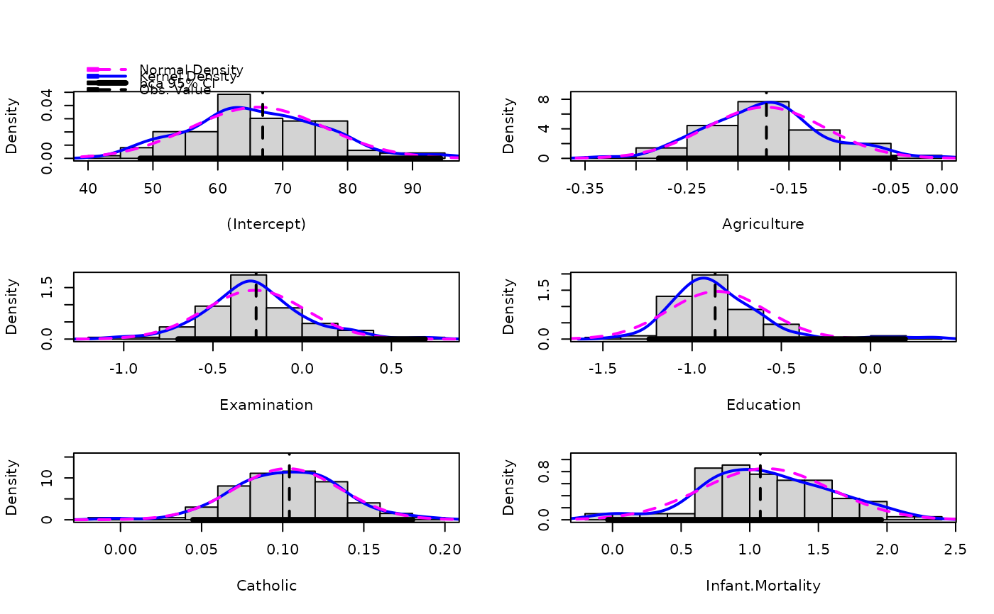 or residual bootstrap for many regression objects. These are method functions for standard generics to summarize the results of the bootstrap. Other tools for this purpose are available in the boot package.